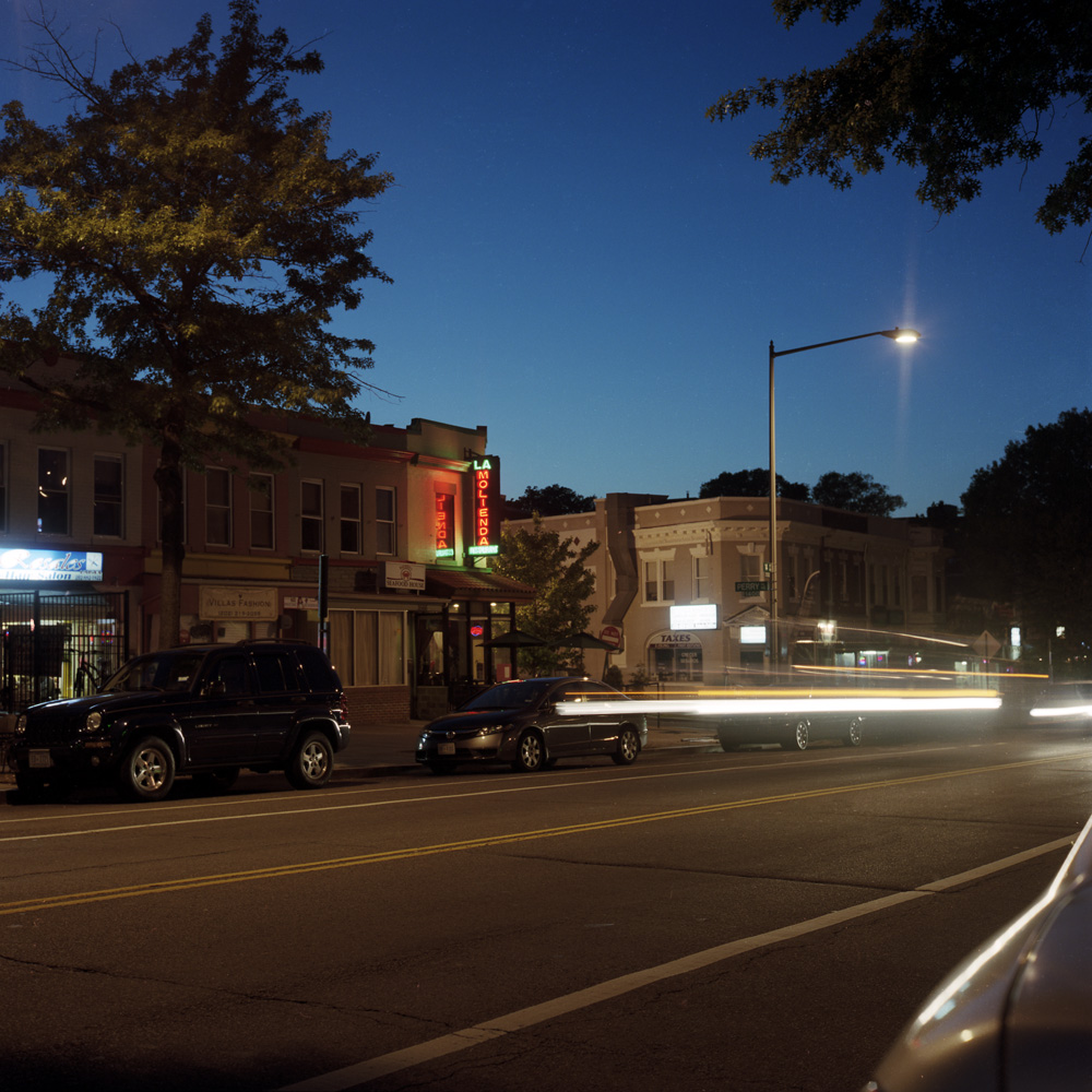 Some twilight photos taken on 14th Street in Columbia Heights. All shots were taken with my Rolleiflex 2.8E on Kodak Portra 160. This time I was using a tripod – the black and white shots were hand-held. While I was out taking these photos, I had someone from Cavalier Liquor come outside and tell me, “you didn’t get permission to take pictures”. He then broke into a smile so I knew he was just teasing. I’ll make a nice print of the picture and bring it to them, one of these days.