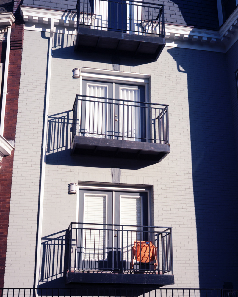 I came across this while walking around my neighborhood. It’s a balcony on a rowhouse converted to condominium apartments. The sun was getting low in the evening sky, casting long shadows. The scene is almost monochromatic, with the exception of the orange chair. Yet the chair is subtle – it doesn’t pop out and smack you in the face. It may have actually been more intense in real life, but I like it as just a touch – too often you see people de-saturating a color image except for one object (usually red), which they then proceed to hyper-saturate in contrast to the scene around it.