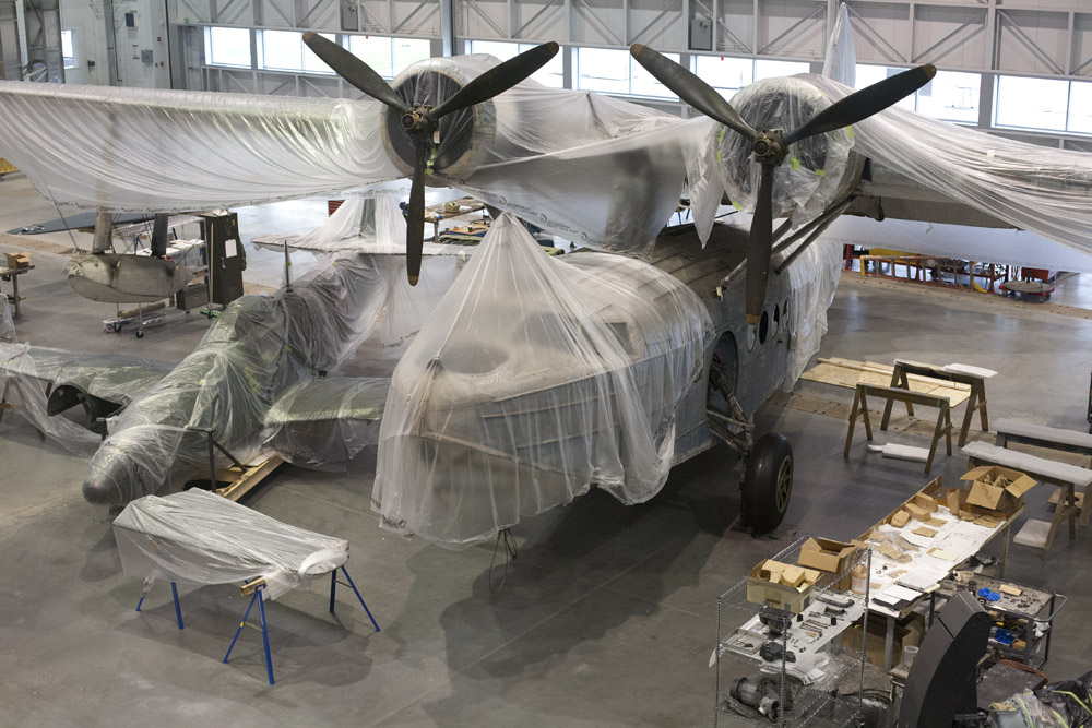 One of the neat things about the Udvar-Hazy center is that they now have the restoration facility open to view. You still can’t go down on the floor of the workshop like you could over at Silver Hill (that was a different place and a different time, where you toured by appointment, but could walk up and touch the Enola Gay, still disassembled and in need of polishing (which they would let you help out with if you wanted to volunteer – the plane has an enormous surface area)). Now they are actively working on a WW II US Navy Hellcat dive bomber (not pictured), and here is a flying boat with what appears to be a Korean War vintage jet fighter underneath its wing.