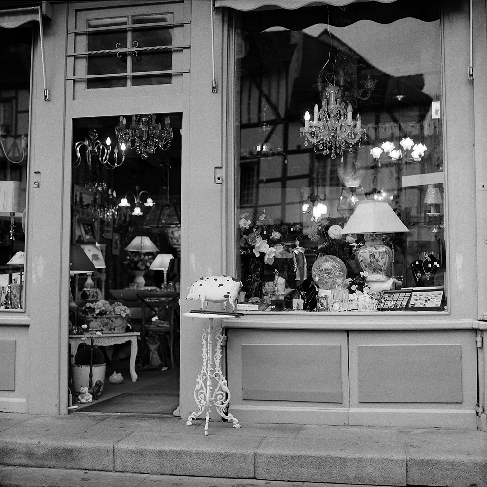 The lamp store was on another corner of the square and had the cutest little pig sign out front. The glow from all the lamps inside was enough to make it easy to balance the exposure between inside and outside.