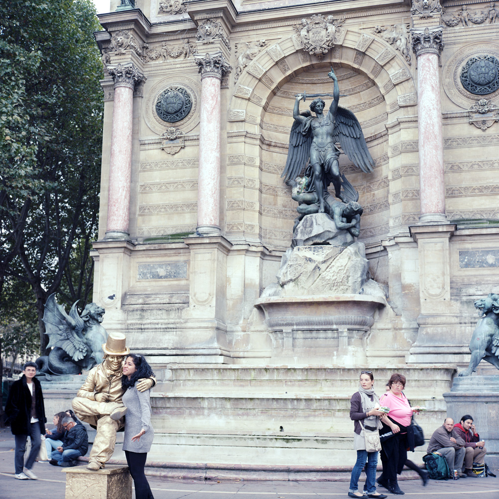 Here is one of the seemingly omnipresent human statues that you find in major european cities. I love the dynamic going on in the picture. The woman posing with him is having her picture taken, but with the photographer outside the frame, the expressions of the passersby take on an entirely different meaning. And Saint Michel on his perch above the fountain looks like he too is about to pronounce judgment with his sword on the entire affair.
