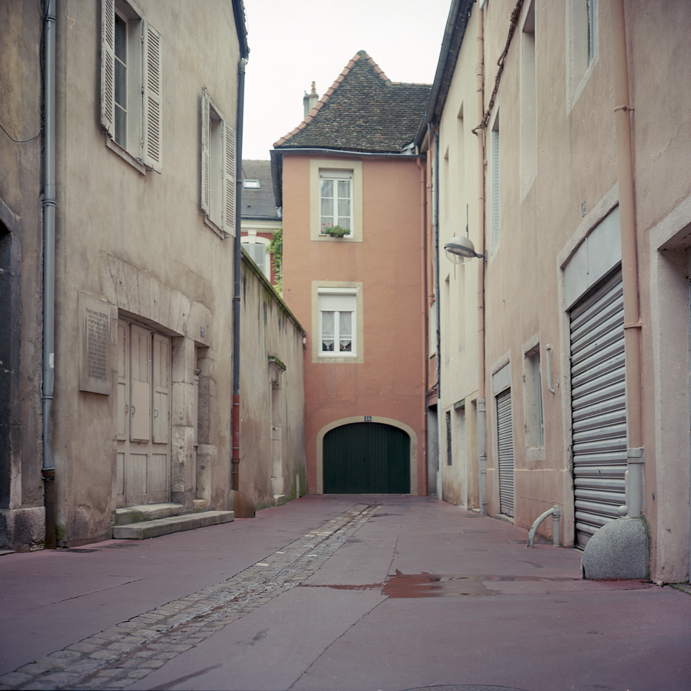 If you look through the archway over the Rue de L’Oratoire, you can see the pedestrian street, the Rue au Change. If the overpass connecting the apartment building with the building across the street looks Swiss, it should not be surprising in Chalon- it is about 70 miles (120km) to Geneva from Chalon. The building in the courtyard to which the iron gate and lamp at the top of this post is attached on the left looks just like a traditional Swiss chalet that you’d expect to see on an alpine meadow, not in the middle of a French town.