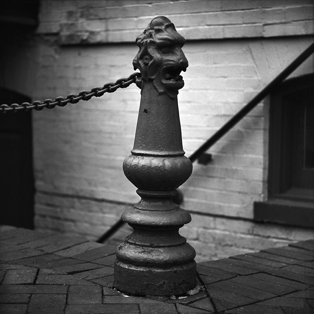 I shot this as another test of the Tele-Rolleiflex, to see what it could do as far as separating the background and foreground. This cast-iron bollard with the dual lions’ heads is on the sidewalk outside ProPhoto, one of the last remaining real camera stores in DC now that Penn Camera/Calumet is gone.