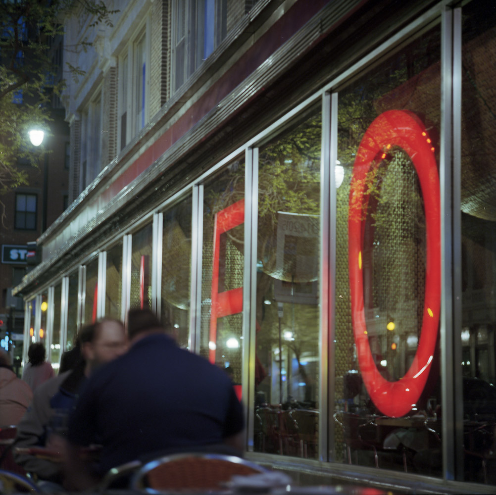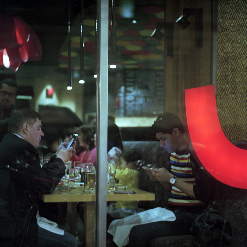 A view into the restaurant. Photographically, what interests me in taking an image like this is the visual layering that happens – there’s reflections in the glass, the big red J, the people at the table, the pendant lights leading you away deep inside the restaurant, the other patrons at tables in the rear. Sociologically, this is another indictment of the modern life – two people at dinner staring at their phones instead of interacting with each other.