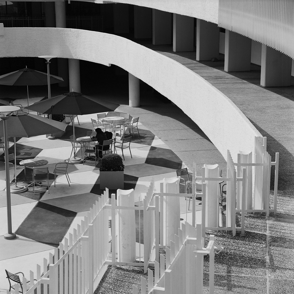 Another view of the courtyard. Again, just one person sitting alone at a table. There’s a restaurant down there, believe it or not.