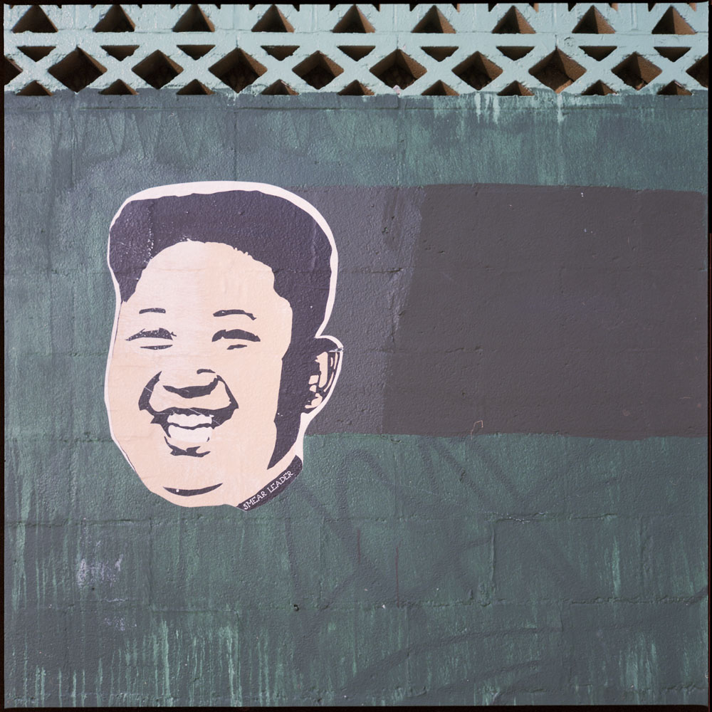 Just because it’s gone hipster doesn’t mean graffiti has lost its edge for political and social commentary. Kim’s collar proclaims him “Smear Leader”.