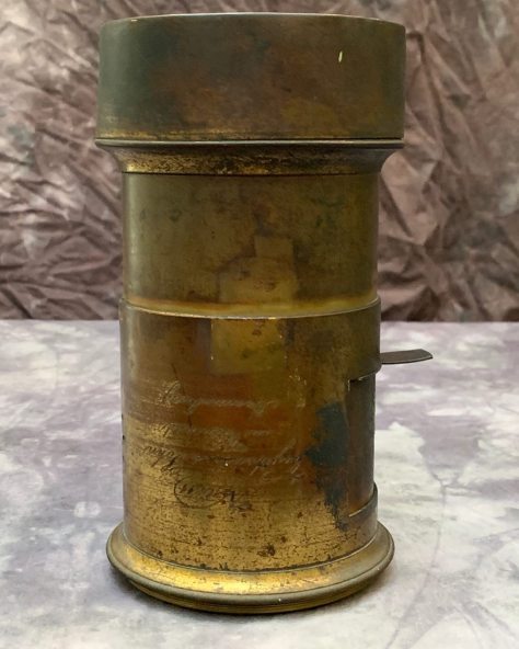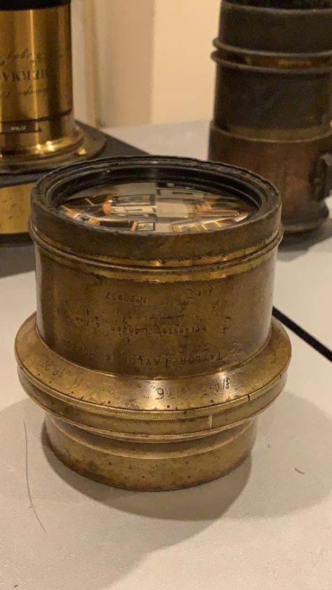 Lurking in the background behind the Cooke is my Hermagis Eidoscope #3 – it’s an 11 inch f5 lens, and most specifically a soft-focus lens. You control the soft focus effect by changing the aperture. The larger the aperture, the softer the effect, the smaller, the sharper. It’s actually a Rapid Rectilinear design, not a Petzval, which some people think that it is because they think that all brass lenses are Petzvals. The Cooke is neither a Petzval nor a Rapid Rectilinear, but rather an Anastigmat, but it too has a reputation as a soft-focus lens, the soft focus being controlled by the aperture, and also by adjusting the spacing on the front element. On the small Cooke lenses like mine, there is no official soft-focus mechanism, but on the bigger, longer portrait lenses, they had a ring that you could turn to adjust the soft-focus effect. Some enterprising individual took it upon themselves to engrave some marks around the front of the barrel to indicate where to turn the front element for soft focus effect. Once I have this lens mounted, I’ll give their markings a try and see what it does.