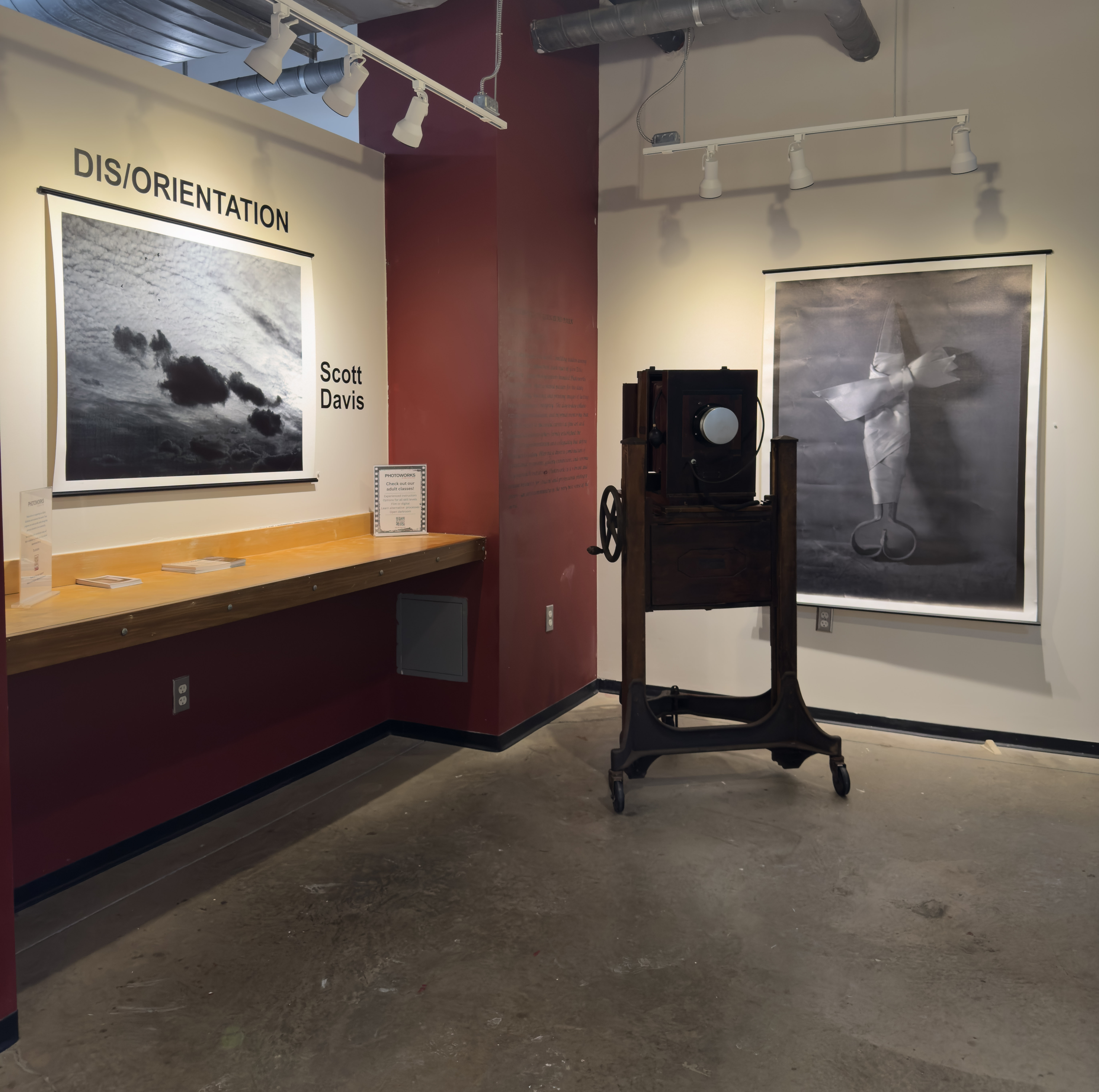 I currently have up on display through March 8th at Glen Echo Photoworks a solo exhibition entitled “Dis/Orientation”. The exhibit consists of 45 images in three rooms. Two rooms are devoted to very large format (20×40, 30×40 and 40×50 inch prints) of images of clouds without horizons or other reference points. The other room is the opposite extreme – 4×5 inch prints of still life images of objects shot on a seamless backdrop, also removing reference points for size, direction, or other context.