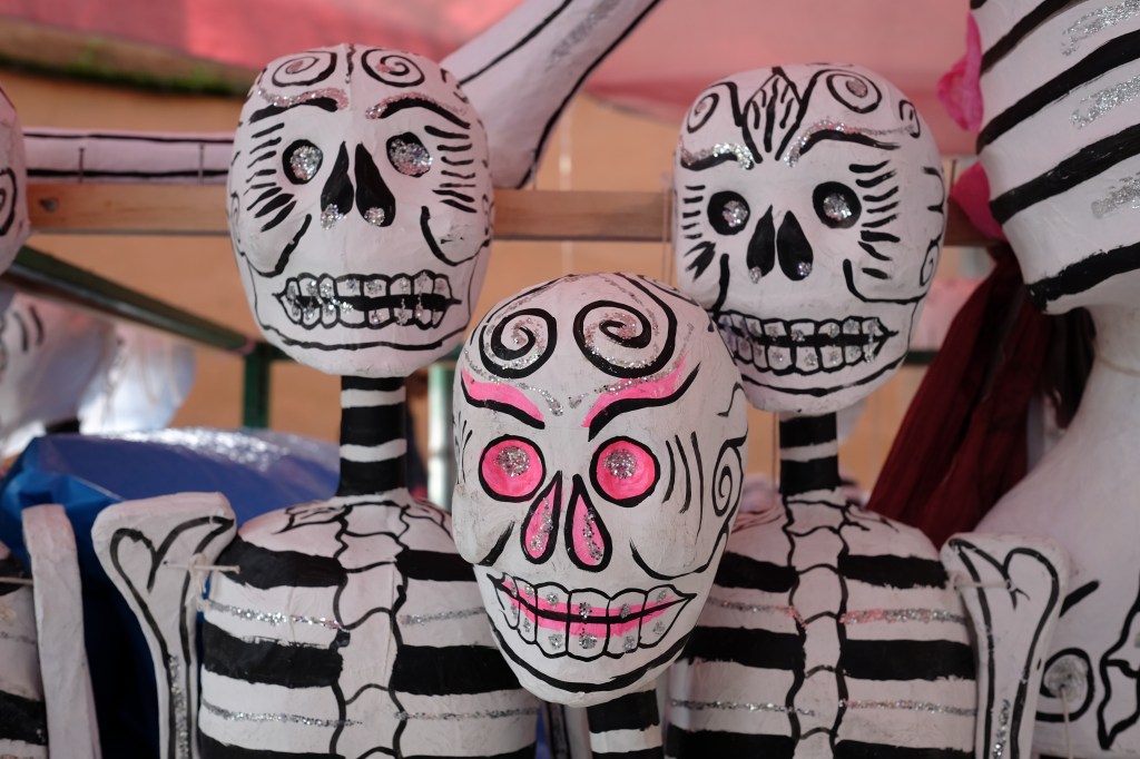 More papier-mache skeletons for sale on the sidewalk in Coyoacan, an historic neighborhood in Mexico City