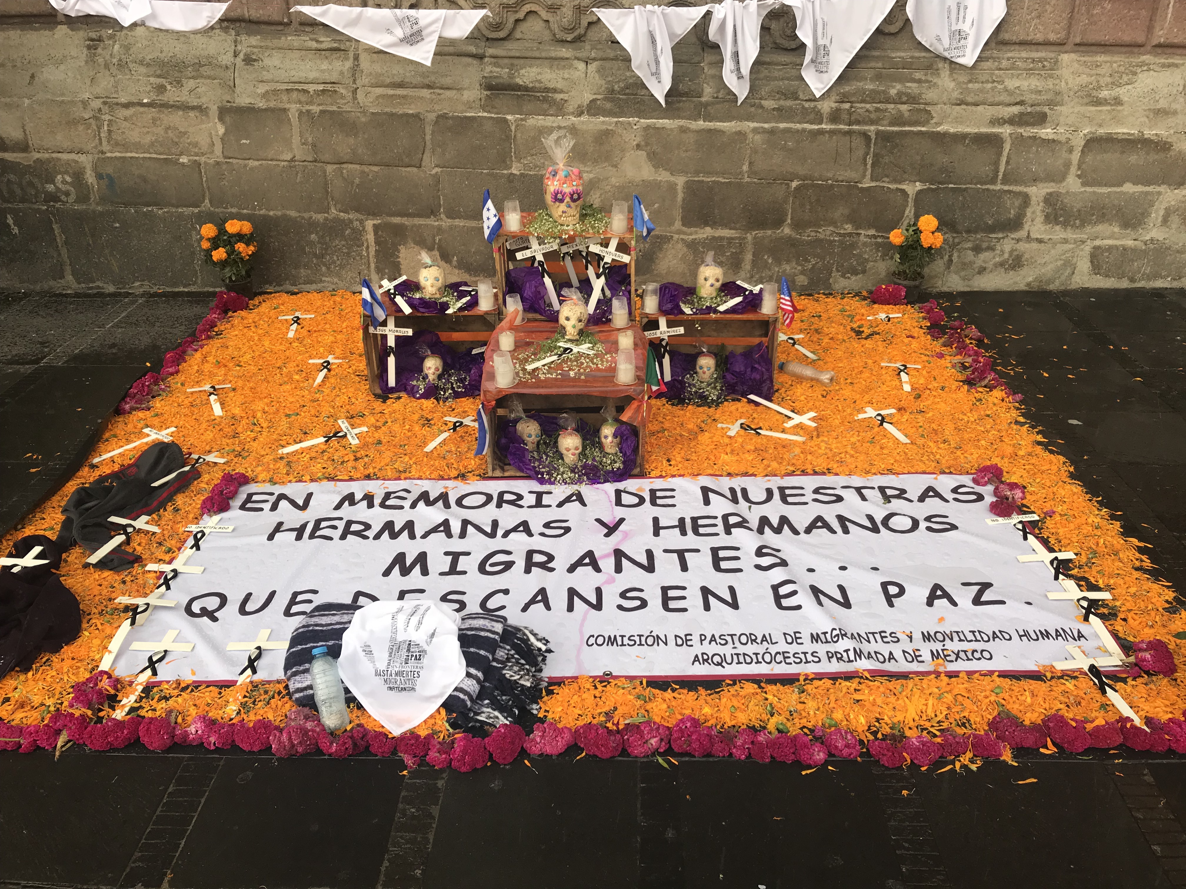 A memorial altar or ofrenda at the front wall of the Metropolitan Cathedral in Mexico City in memory of migrants who died fleeing violence and poverty in Central America.
