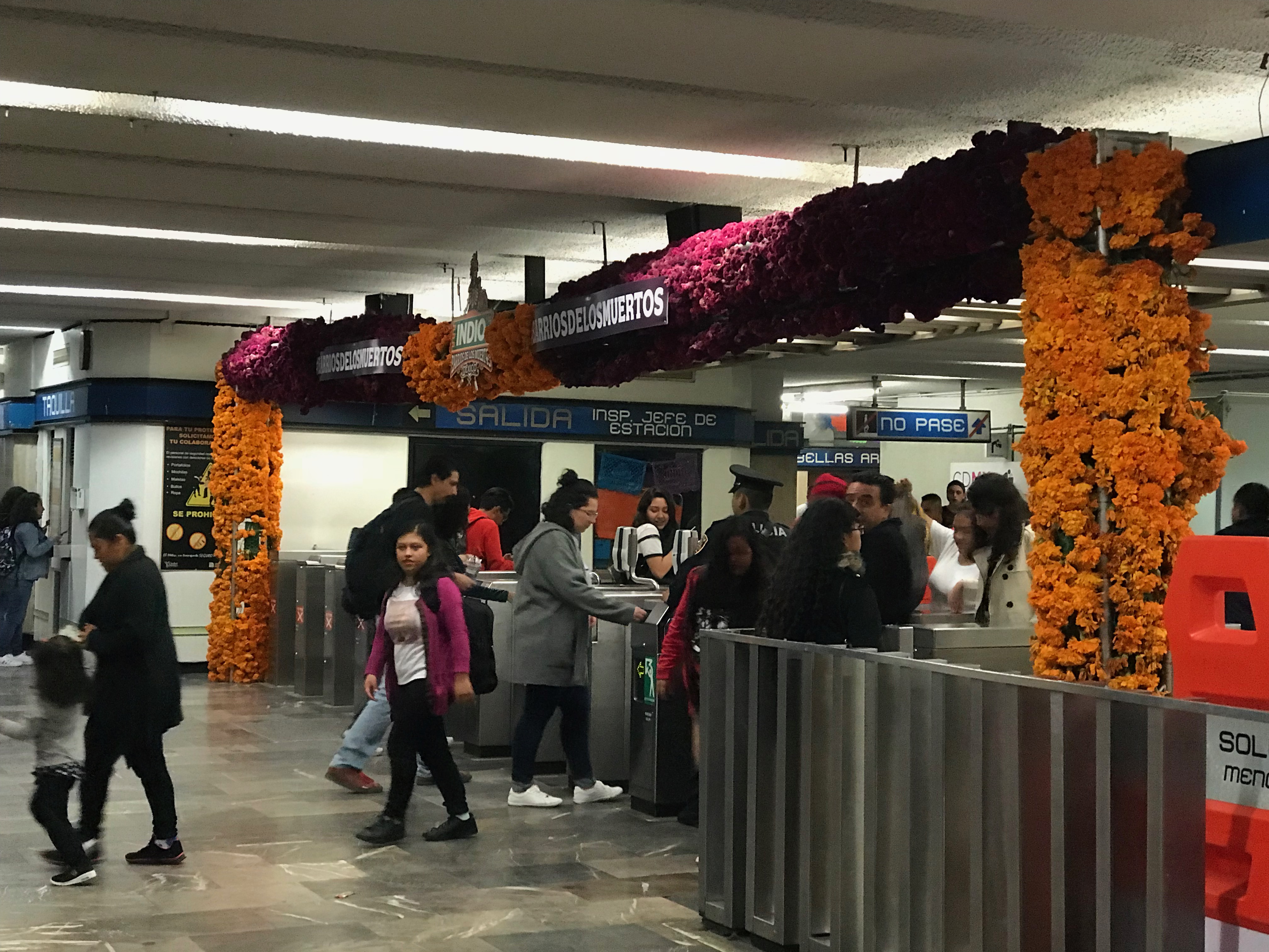 Even the Mexico City metro system gets into the spirit. Turnstiles decorated with the traditional orange cempasuchitl (marigolds).