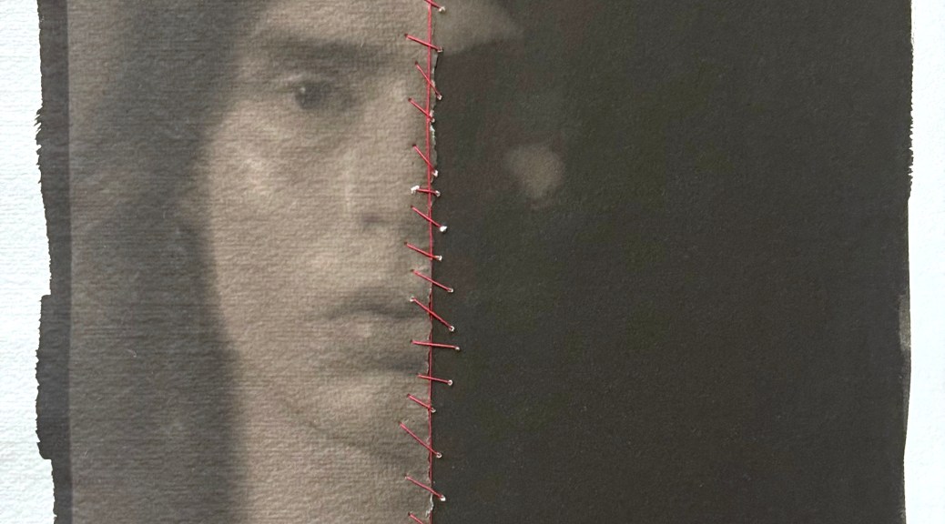 I have thought for quite some time about trying this, and thanks to a little push from my friend Jeremy Moore who lives down in Texas, I took the plunge last night and did some interventions on my prints that many would consider heretical. I made two different digital negatives from the same image, one with high contrast and one with normal contrast. The one with normal contrast I printed on Velke Losiny Prague, which is a light-weight cold-press paper with lots of texture. The high-contrast/dark print is on Revere Platinum, which is a heavy-weight hot press smooth paper. I then tore the print on the Velke Losiny paper in half, and then stitched the two prints together with red thread.
