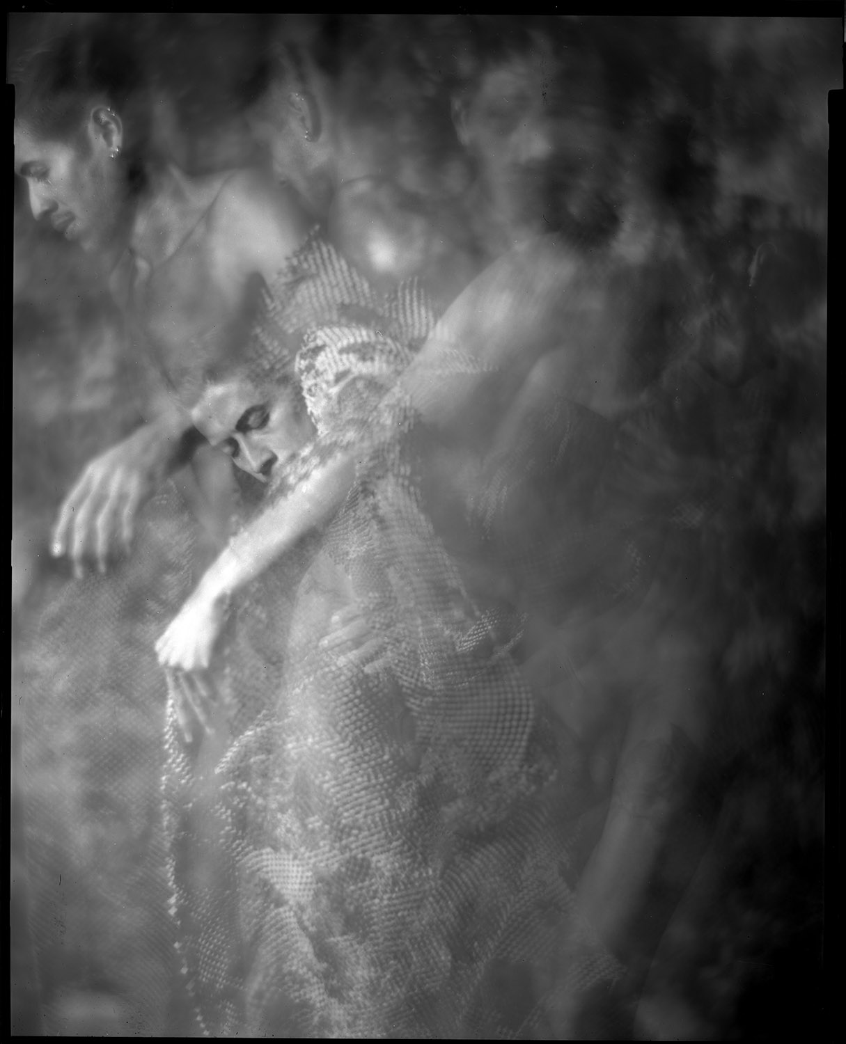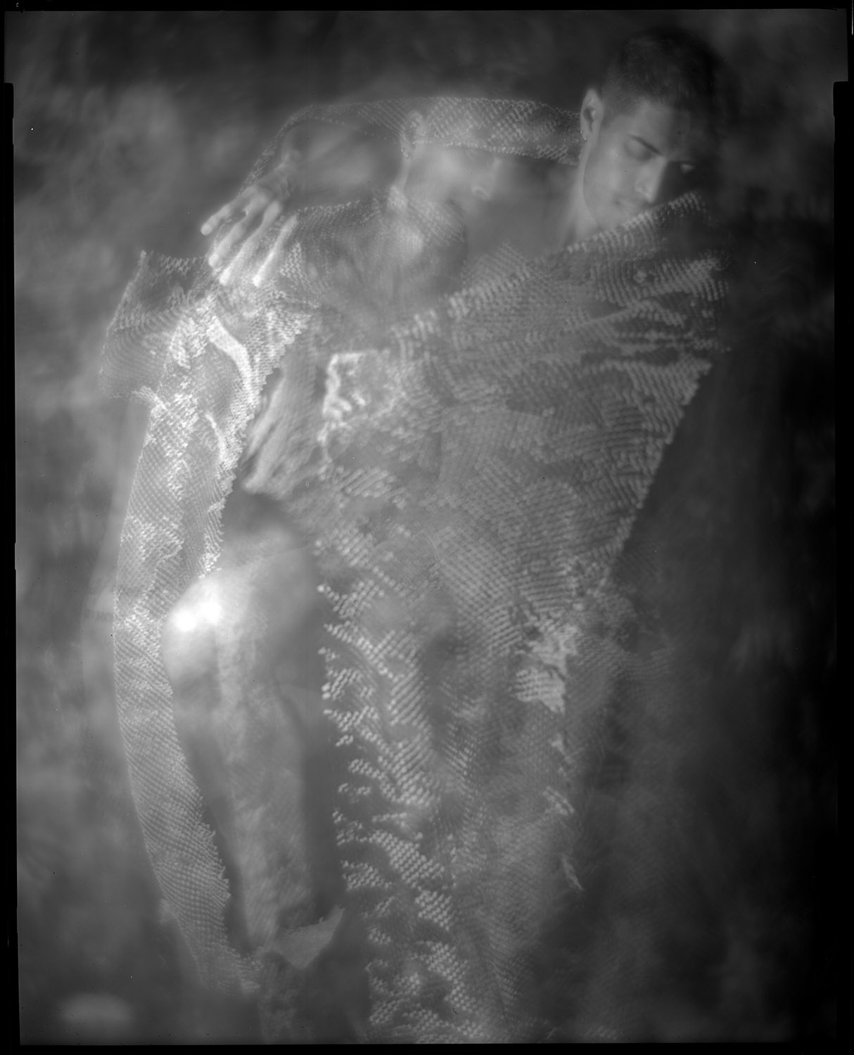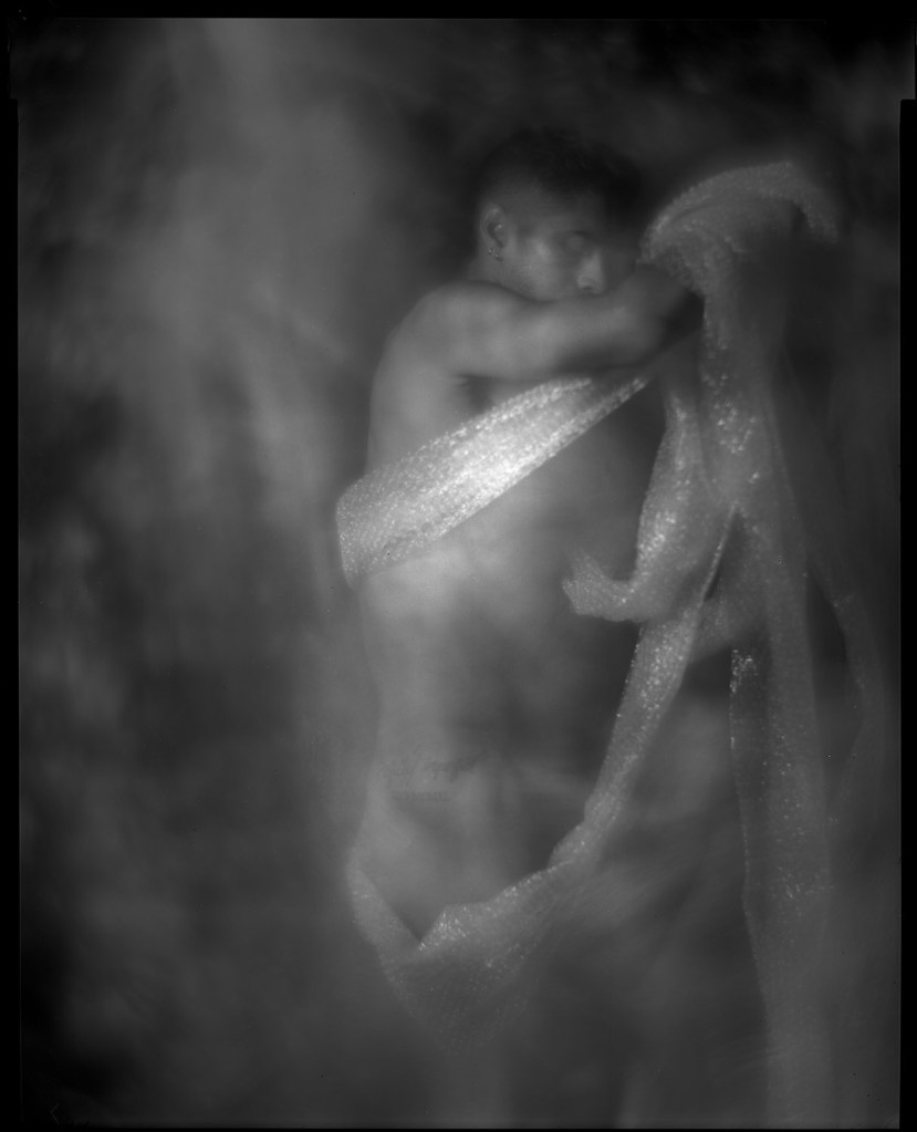 I also enjoy using the limitations of my tools creatively and making them do things they aren’t necessarily intended for. We did this series with my 8×10 inch studio portrait camera, which is a big, heavy, relatively immobile beast. It has a Packard shutter to control exposure, which is a fairly crude, imprecise device (top speed is 1/30th-ish of a second). But what it does do is allow me to keep the shutter open for an extended period with the pneumatic squeeze bulb. So for these motion study shots, I opened the shutter, let Gabriel my model dance, and randomly popped my flash multiple times during the exposure. Very imprecise, very guesstimate, very subject to the whims of serendipity or disaster.