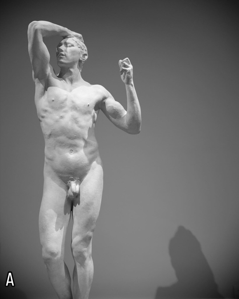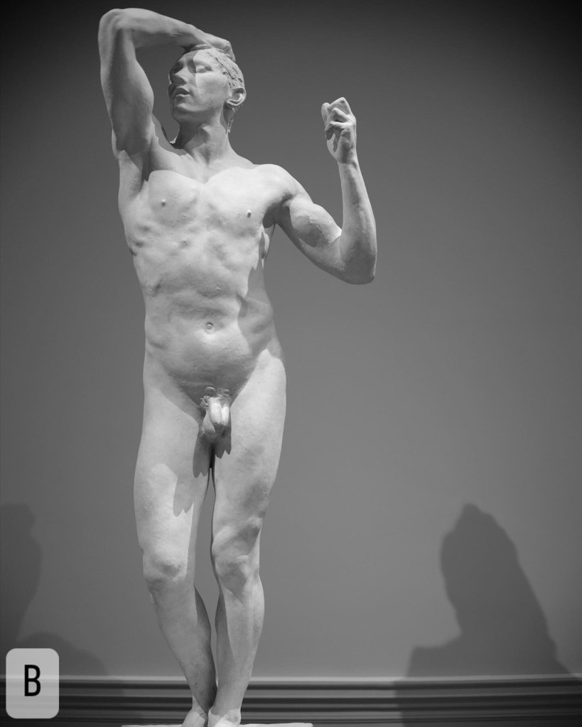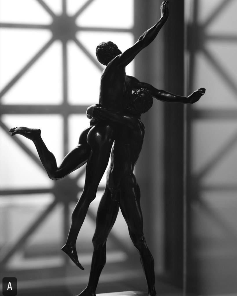 I’ve had a project idea burbling around in the back of my brain for a year now – I got started thinking about this after a trip to Richmond, Virginia to the Virginia Museum of Fine Art, and looking at the ancient bronze and marble sculptures, the Greek pottery, and even more modern artwork that carries an erotic subtext (or even overt eroticism). I wanted to do something that speaks to the role museums play in simultaneously preserving that and in whitewashing it – having work that has queer context in a museum permits the preservation and transmission of the queer gaze AND allows non-queer viewers to dismiss that quality of the work.
