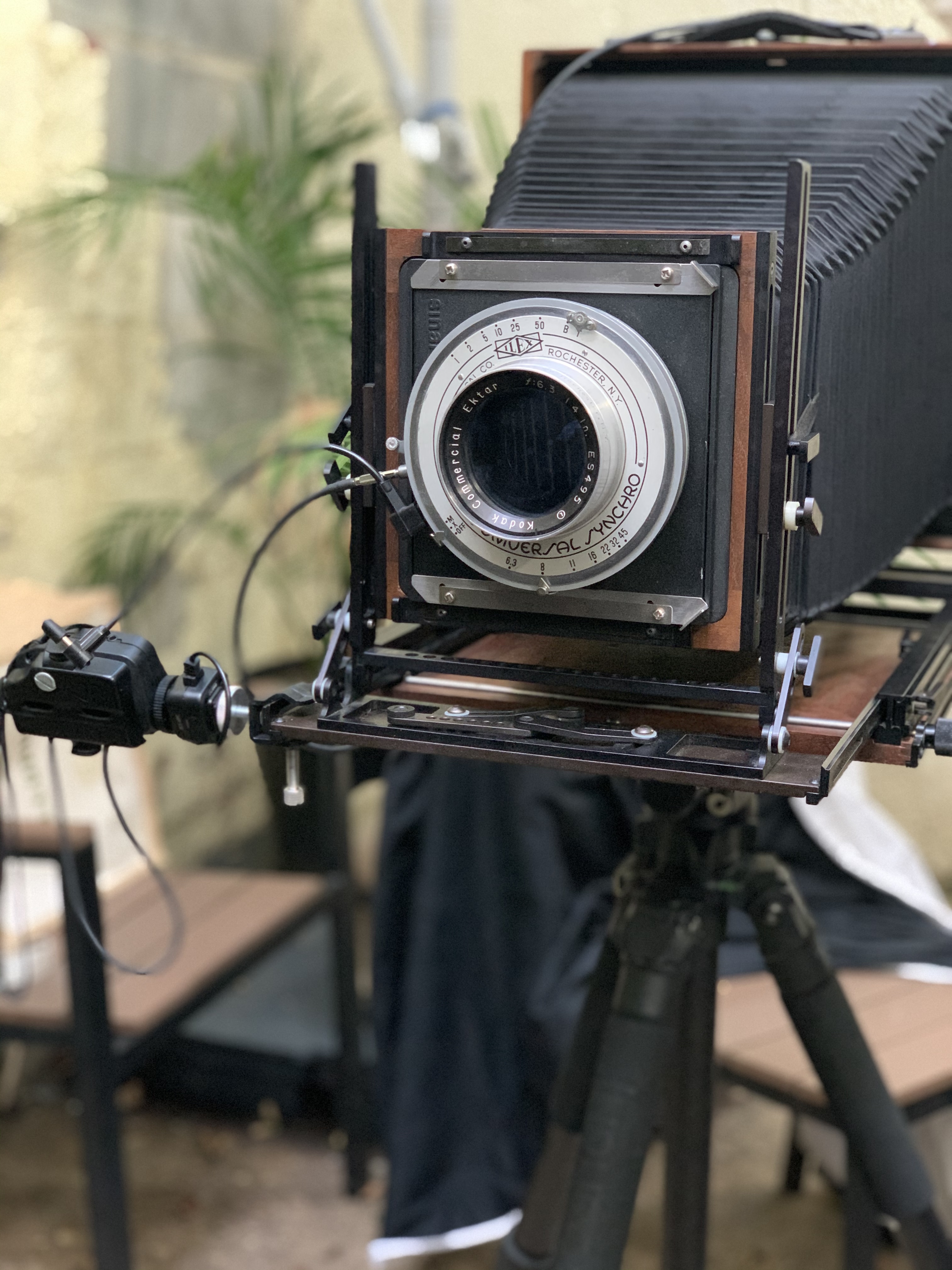 I also enjoy using the limitations of my tools creatively and making them do things they aren’t necessarily intended for. We did this series with my 8×10 inch studio portrait camera, which is a big, heavy, relatively immobile beast. It has a Packard shutter to control exposure, which is a fairly crude, imprecise device (top speed is 1/30th-ish of a second). But what it does do is allow me to keep the shutter open for an extended period with the pneumatic squeeze bulb. So for these motion study shots, I opened the shutter, let Gabriel my model dance, and randomly popped my flash multiple times during the exposure. Very imprecise, very guesstimate, very subject to the whims of serendipity or disaster.
