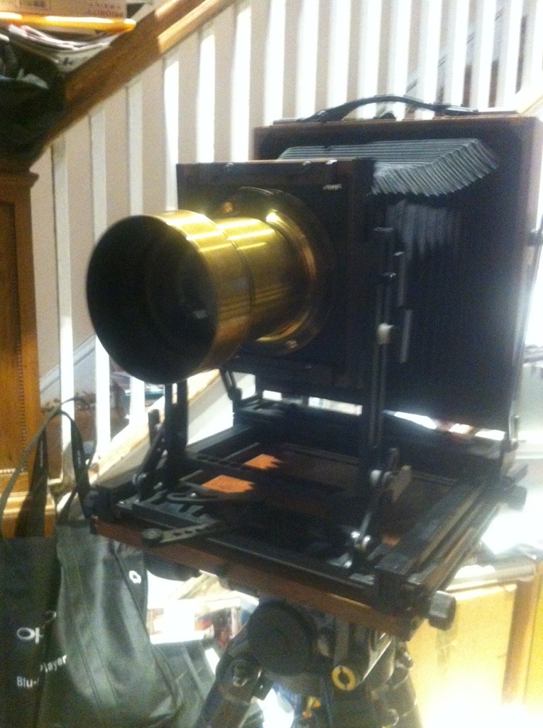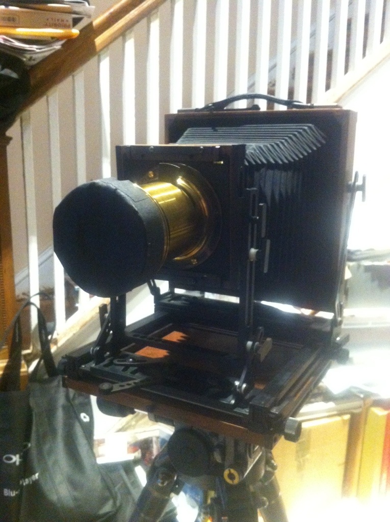 As I mentioned previously, the Hermagis Eidoscope does not have a shutter in addition to not having an iris diaphragm for the aperture control, so I used a pair of spare dark slides from an old 5×7 film holder, held in a V configuration, as the shutter. I was able to pull off a roughly 1/30th second shutter speed by keeping the gap between the dark slides relatively modest (about a 20 degree wedge). Eventually I’ll print these in platinum/palladium.