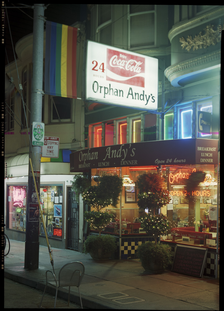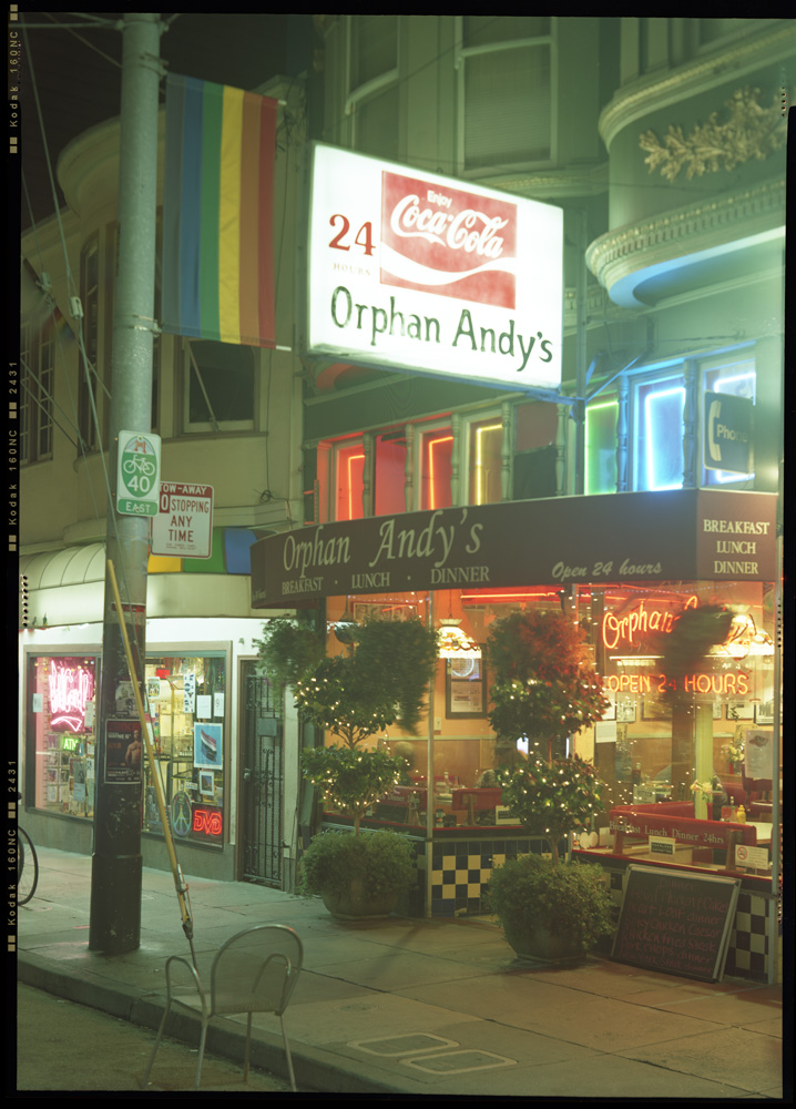 I LOVE Kodak Portra 160nc film after this exercise though – it is VERY easy to scan (with decent software – with craptastic software no film scans easily) and it handles chaotically mixed lighting conditions with ease and aplomb. In the shot I was scanning last night, I had rainbow-colored neon, sodium-vapor streetlights, and fluorescent and incandescent interior lighting, at night, all in the same scene. The only thing I had to color correct for was a minor overall tint caused by sloppy processing at the lab I used at the time. Pretty amazing stuff. Now if they’d only charge less than $350 for a 50 sheet box of the stuff, I’d shoot it more often!
