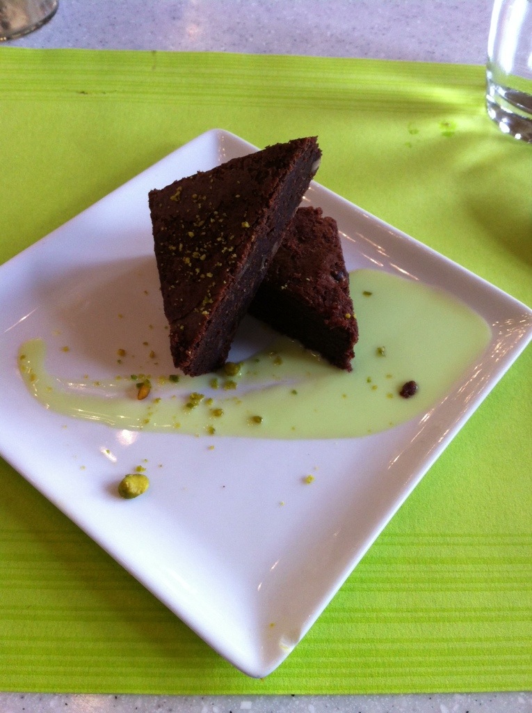 Salmon in a cream broth with potato purée topped with pesto, and brownies with pistachio crumbles and sauce: