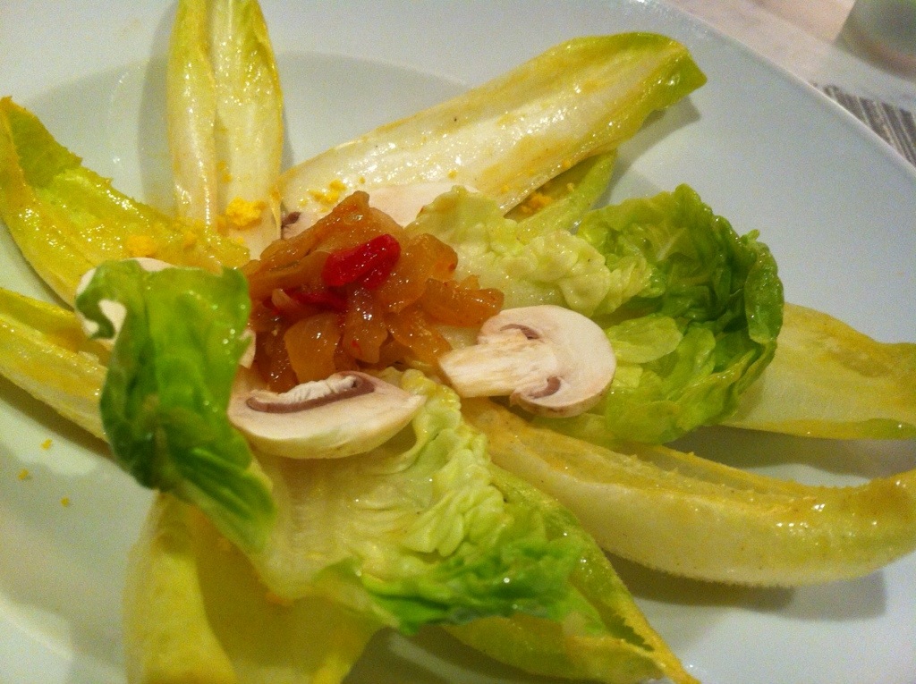 Endive salad with raw white mushrooms, sautéed onions with sweet red peppers, sprinkled with crumbled egg yolk, grilled pork with a pumpkin casserole topped with a cream sauce and gruyere cheese, and the wildest eclair you’ve ever seen: