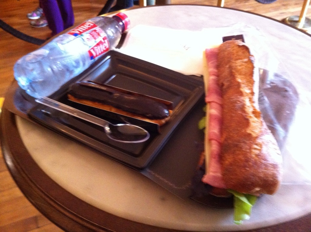 Lunch at the take-away counter at Versailles. A ham sandwich and an eclair: