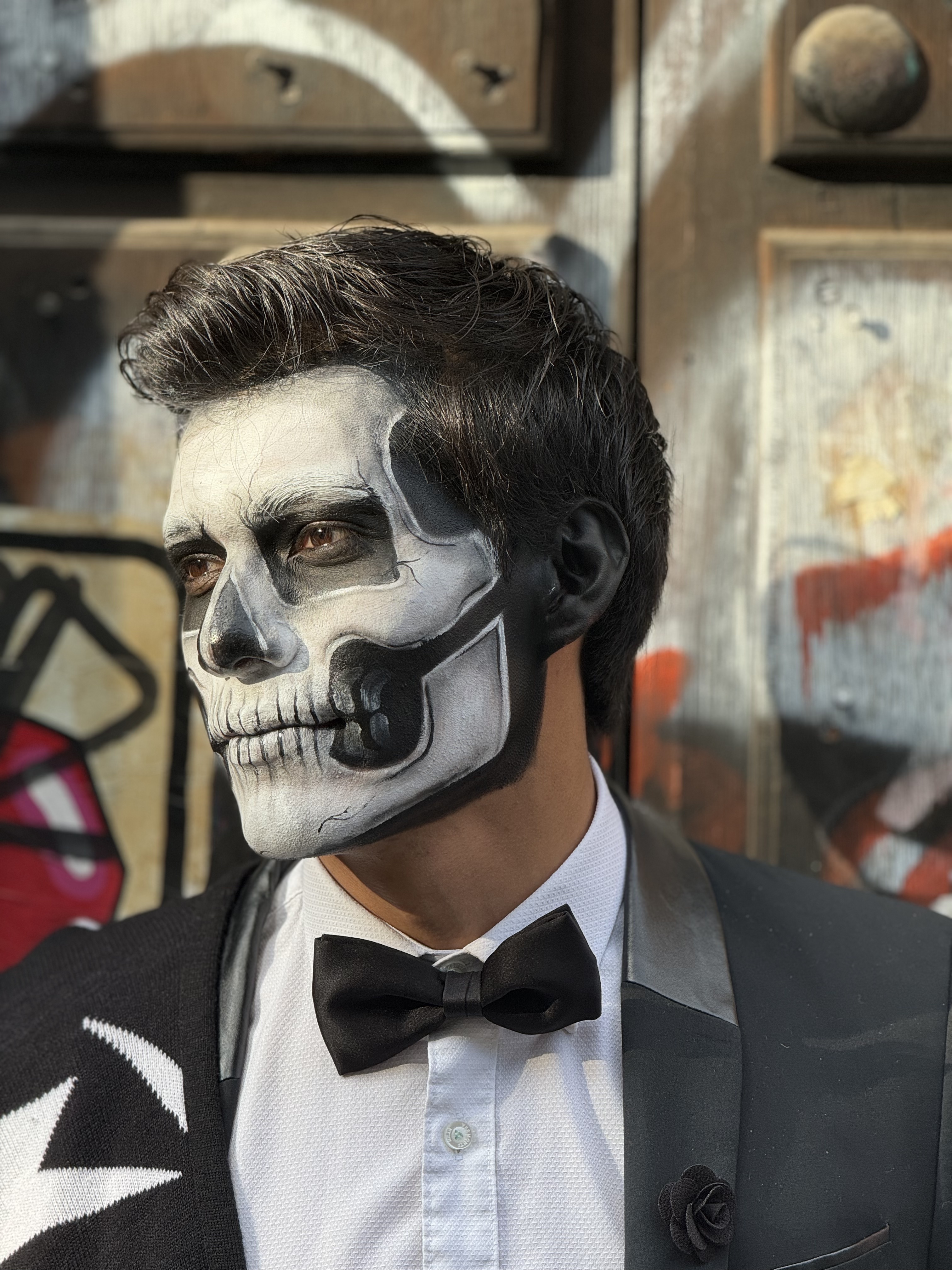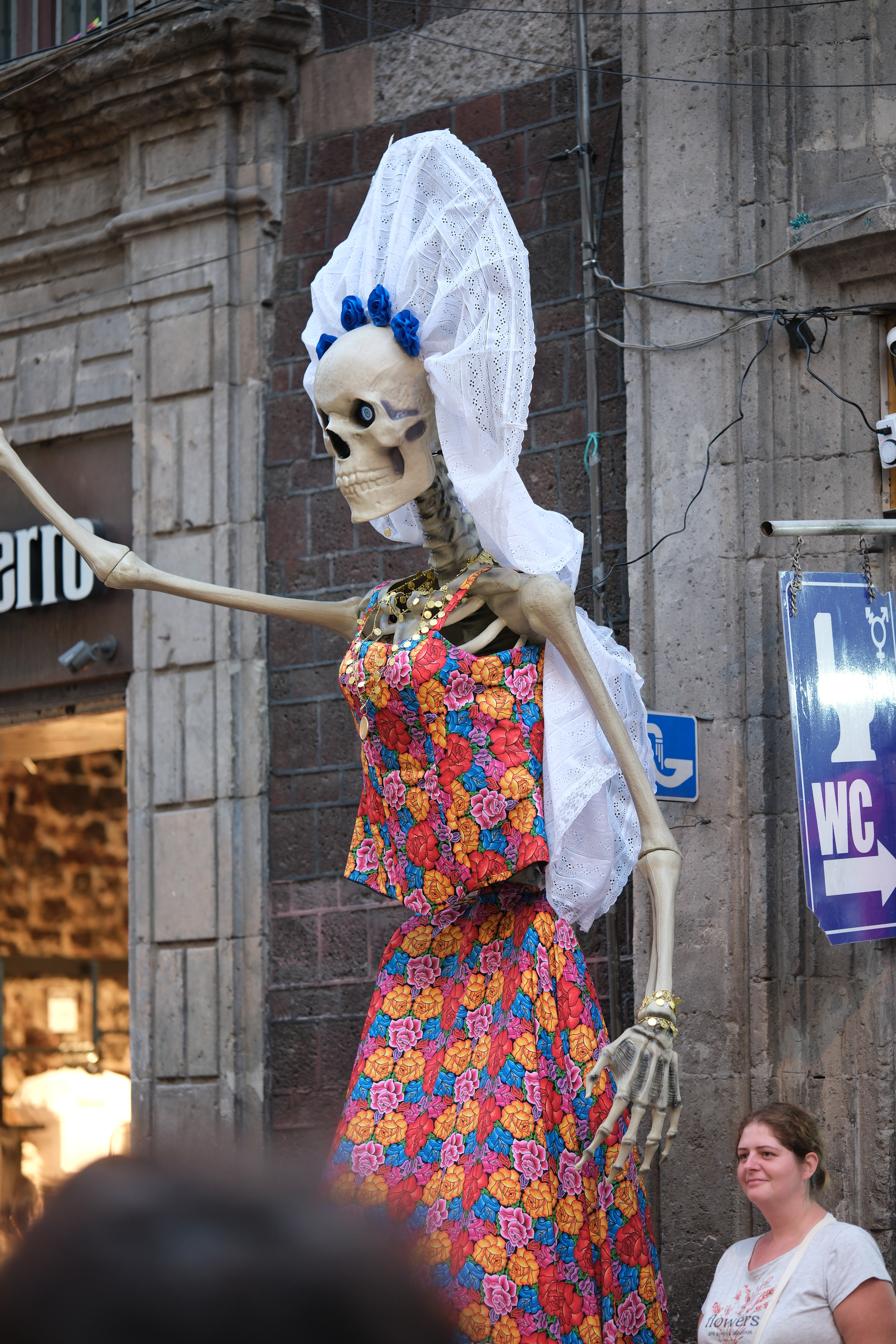 After the official end of the conference, a bunch of us took the day to go down to Coyoacán and wander around. Lots of Day of the Dead decorations were on display, and a good time was had by all. We grabbed lunch at an outdoor table at Restaurante Ave Maria, who was having a mole festival on the menu – I had a Oaxacan mole over beef which was very rich and delicious. We were serenaded by several strolling musicians – one an older gentleman with a guitar doing traditional Mexican songs, and then a group of young Mexican boys rapping. While their music wasn’t to my taste, they got big props for freestyle ad-libbing a rhyme about the gringo with the camera! I’m still building my street photography skills, especially when it comes to photographing people. As we were heading back to the Metro, I saw this guy with the most incredible style and makeup, and had to take the chance to ask him for a photo. You’ll see the results – he had half his face painted with the calavera, and the other unpainted, and he was decked out in what would certainly qualify as vintage Punk style – he would have fit right in on Kings Road in London in 1983.