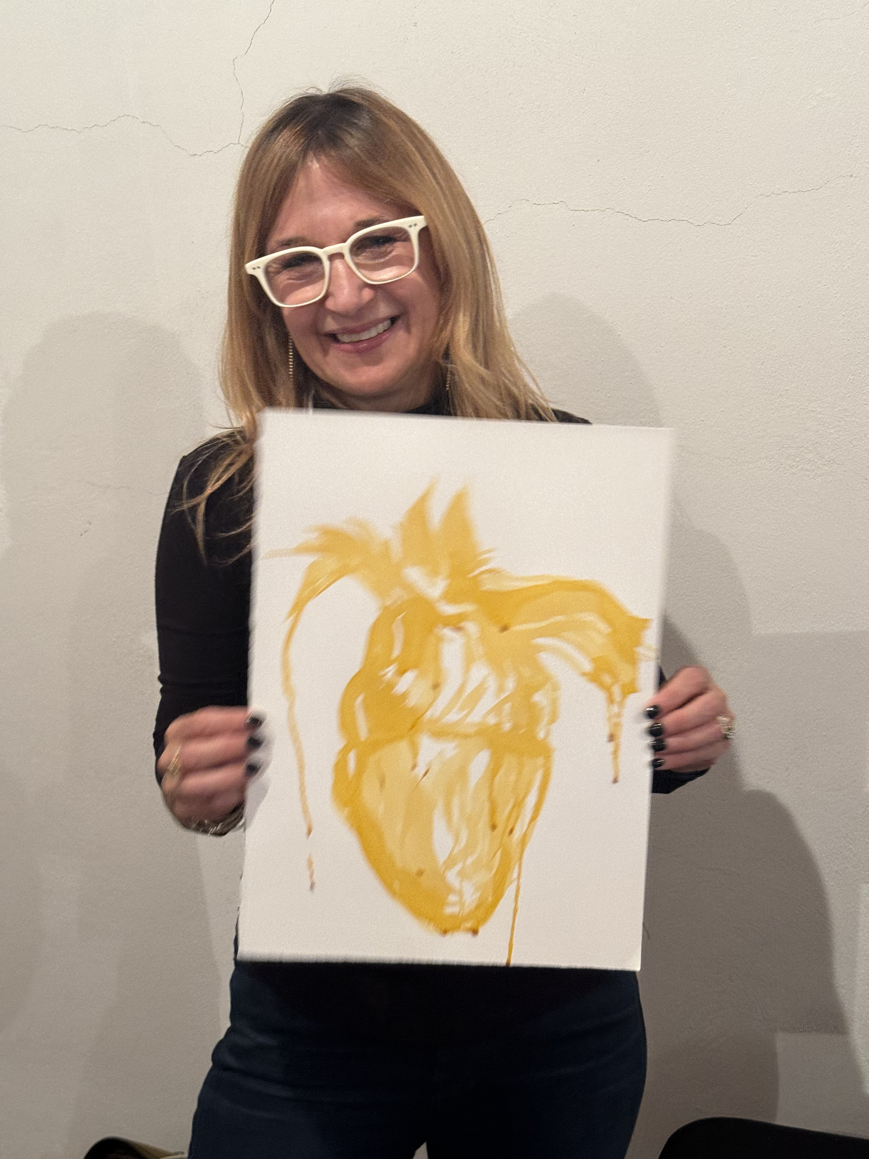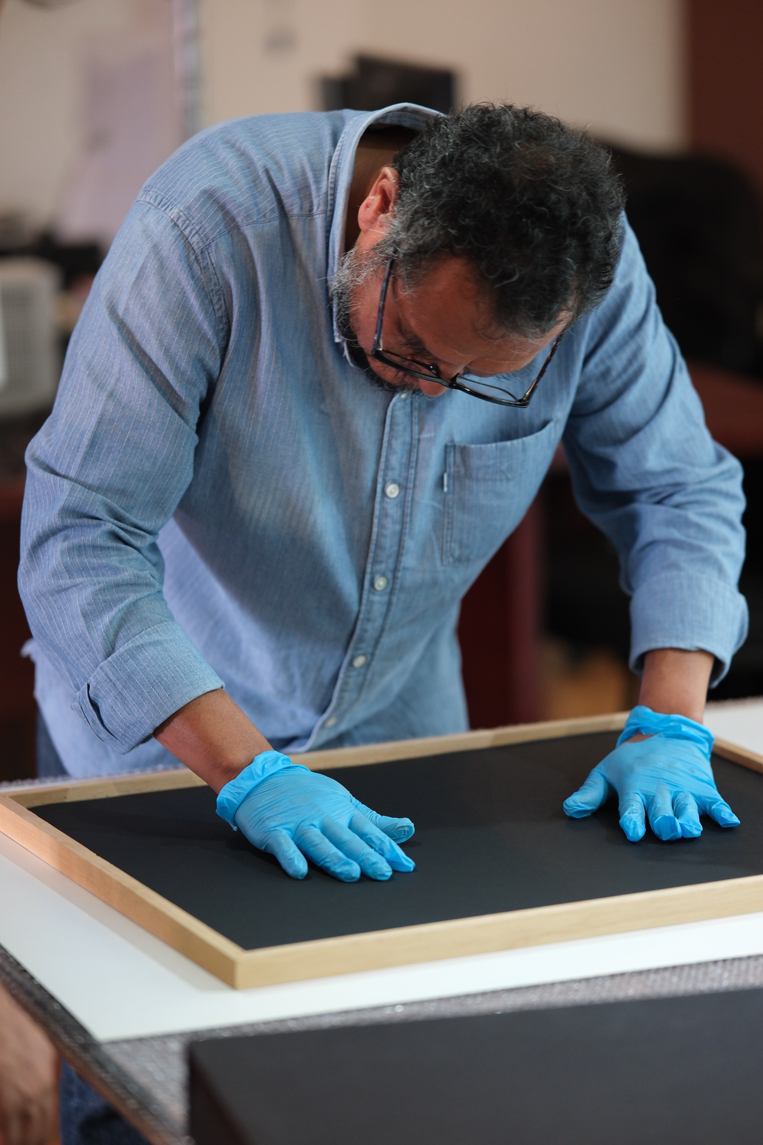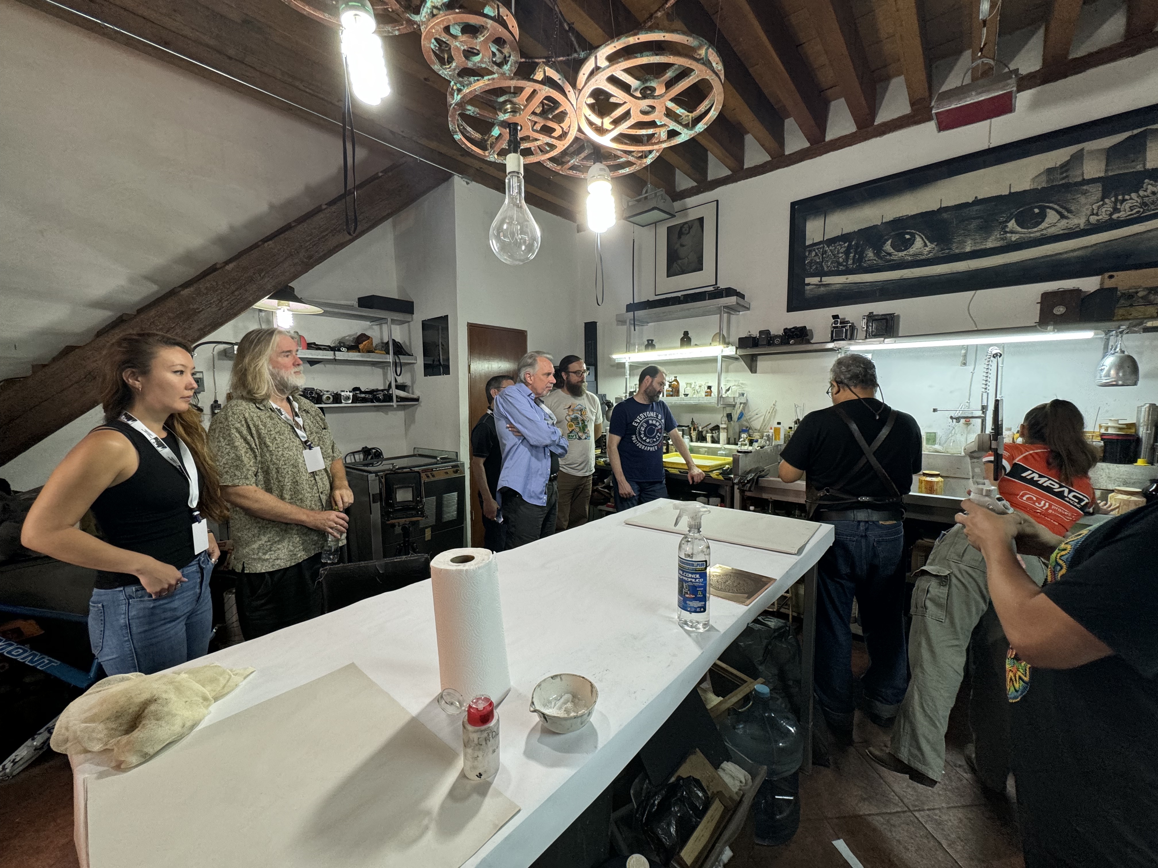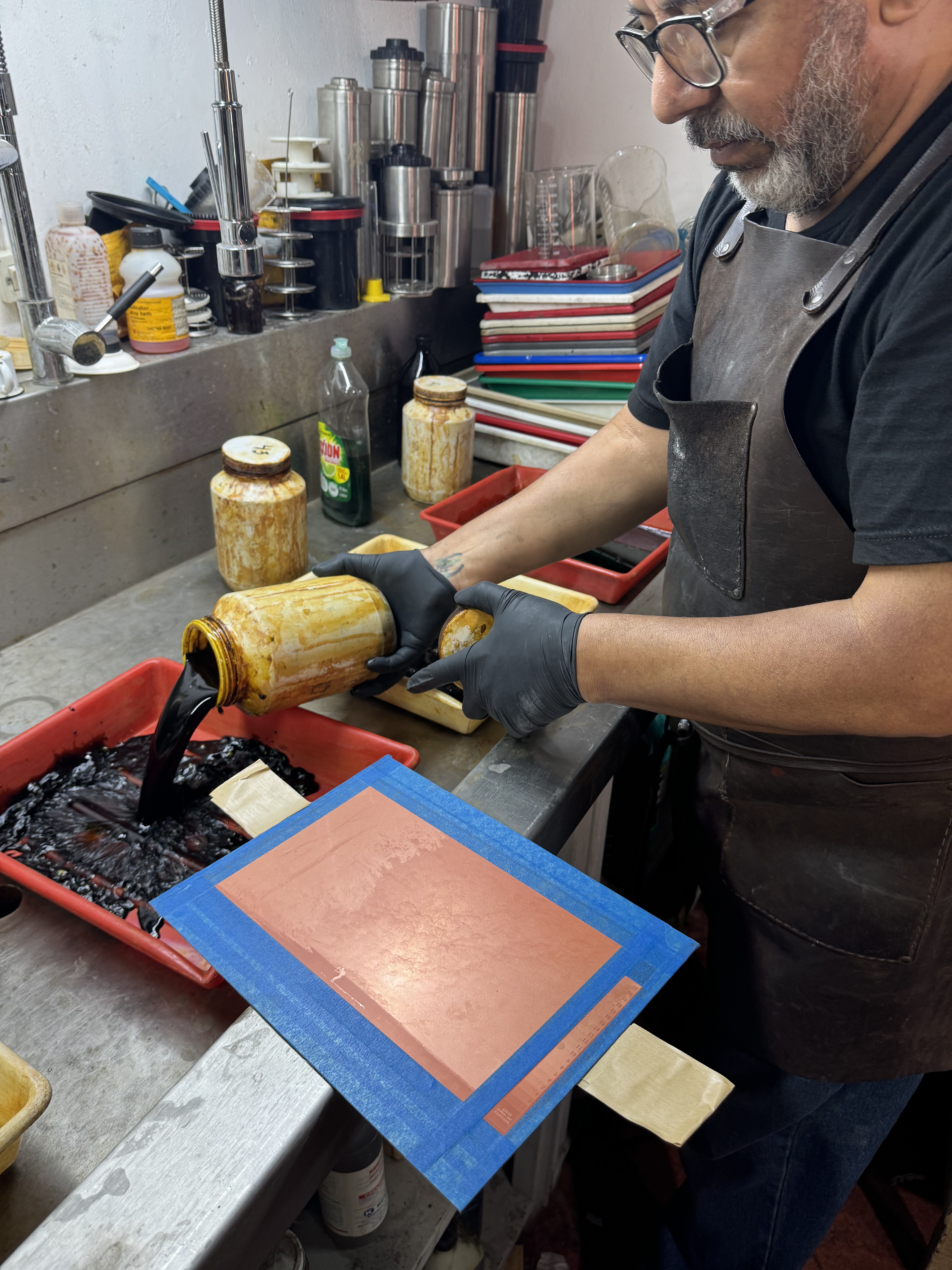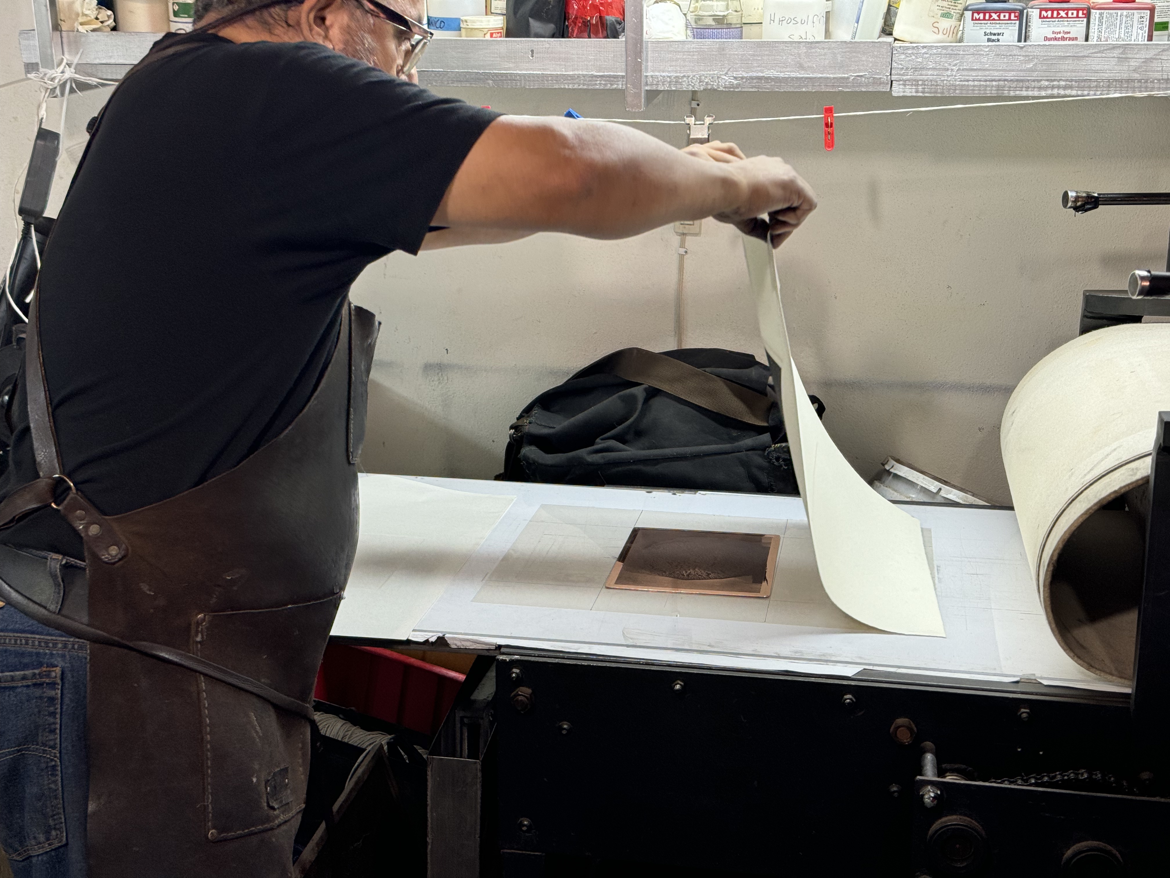 Mary Quin showing one of her hearts – work in progressEarly work in Palladium by Mary QuinOne of Mary Quin’s butterflieshand-drawn heart in palladiumMary Quin with mannequin leg collageArturo Talavera’s studioArturo about to etch a plateArturo examining the etched plateetched plate with ink, ready to pressPrint and etching plate after running through the pressfinished printArturo examining finished print
