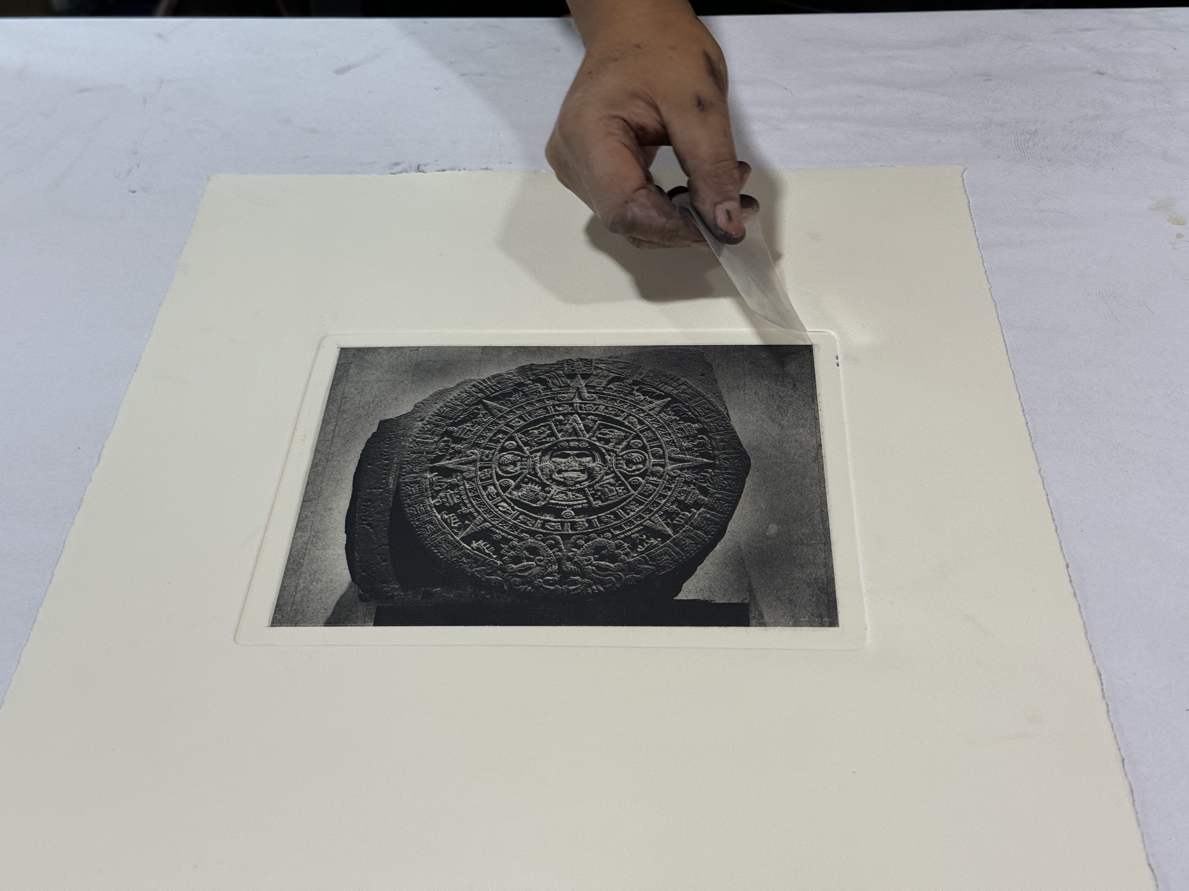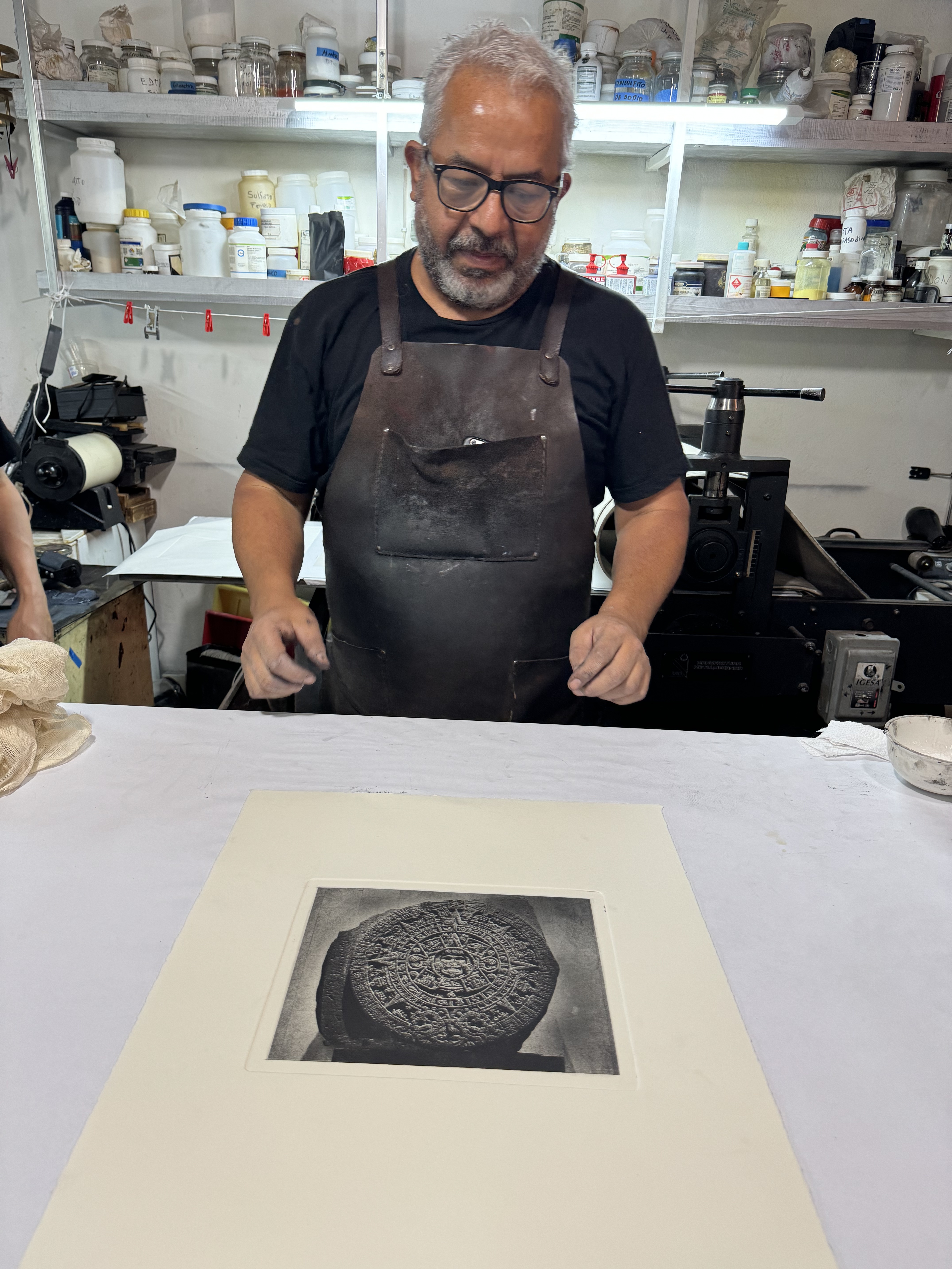 We also had presentations by Mary Quin and Arturo Talavera. Mary is an innovative artist from Alabama who began her photographic career working with large format cameras making traditional photographic images and has evolved into making “intuitive” images where she paints and drips photo chemistry onto paper to create images. Mary also gave a hands-on demo to the attendees of her technique. Arturo is a photographer from Mexico City and a master of multiple historic photo processes. Arturo hosted us for a morning in his studio where he demonstrated making a copper-plate photogravure image of the Aztec “Sun Stone” housed in the Anthropology Museum; his original plate from which he created the gravure was a whole plate size Daguerreotype!