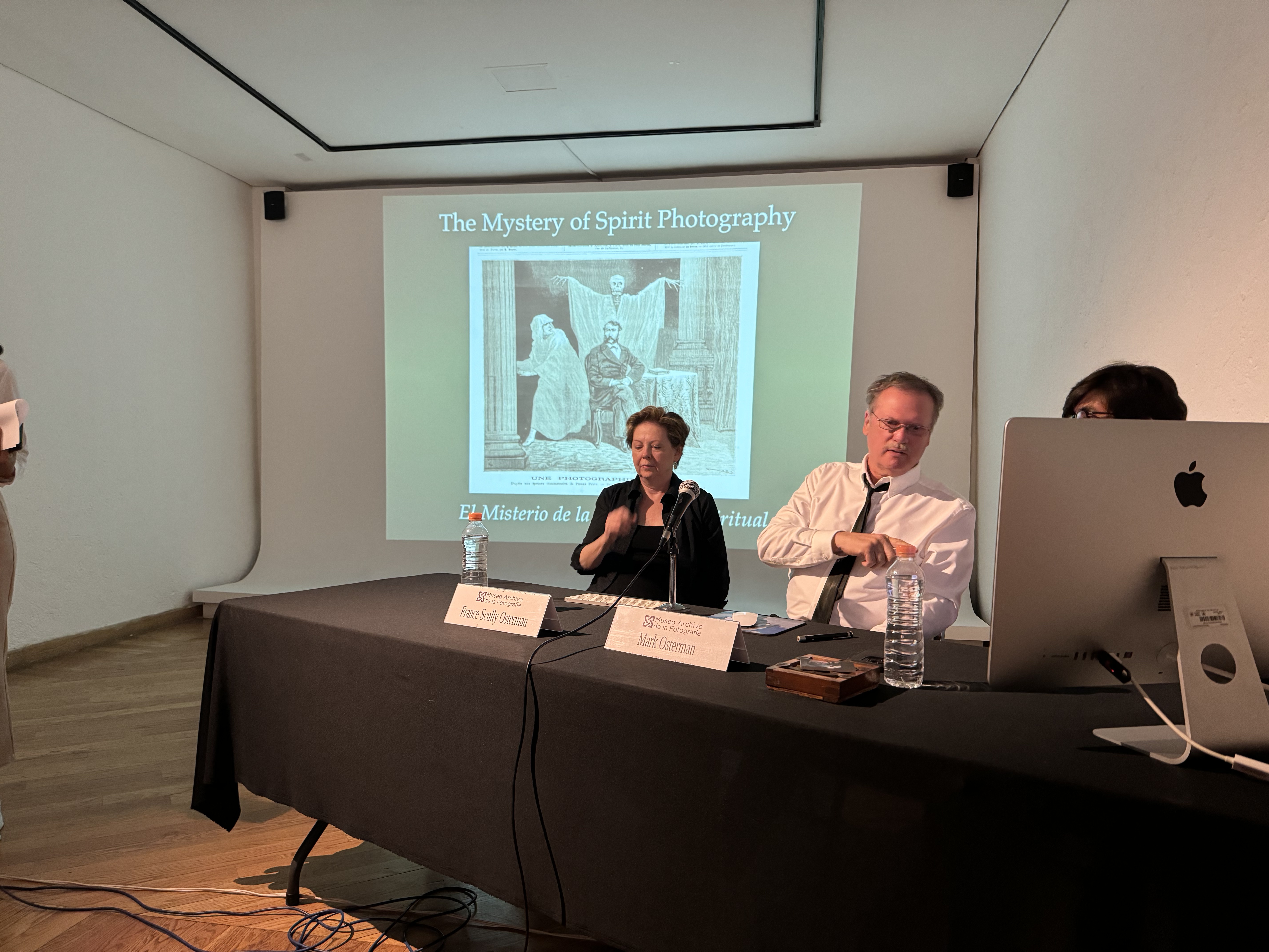 Our closing night keynote was presented at the Museo Archivo de la Fotografia by Mark and France Scully Osterman, who talked about 19th century spirit photography, an especially timely topic as we were on the cusp of the Day of the Dead weekend in Mexico City. Another resounding success, with a standing room only crowd, Mark and France talked about the origins of spirit photography in the middle 19th century, with the aftermath of the US Civil War being a significant driver of the interest in spiritualism that encouraged the practice. They also talked about the HOW it was done, with techniques ranging from simple long exposures that rendered moving figures in the image as ghostly presences, to advanced methods for manipulation and trickery to give the impression of spiritual manifestations. The evening closed out on the roof of the museum overlooking the Metropolitan Cathedral and the ruins of the Templo Mayor and some celebratory wine was shared by all. The first image is of the wonderful young man who did the live translation for Mark and France’s talk; he did an outstanding job!