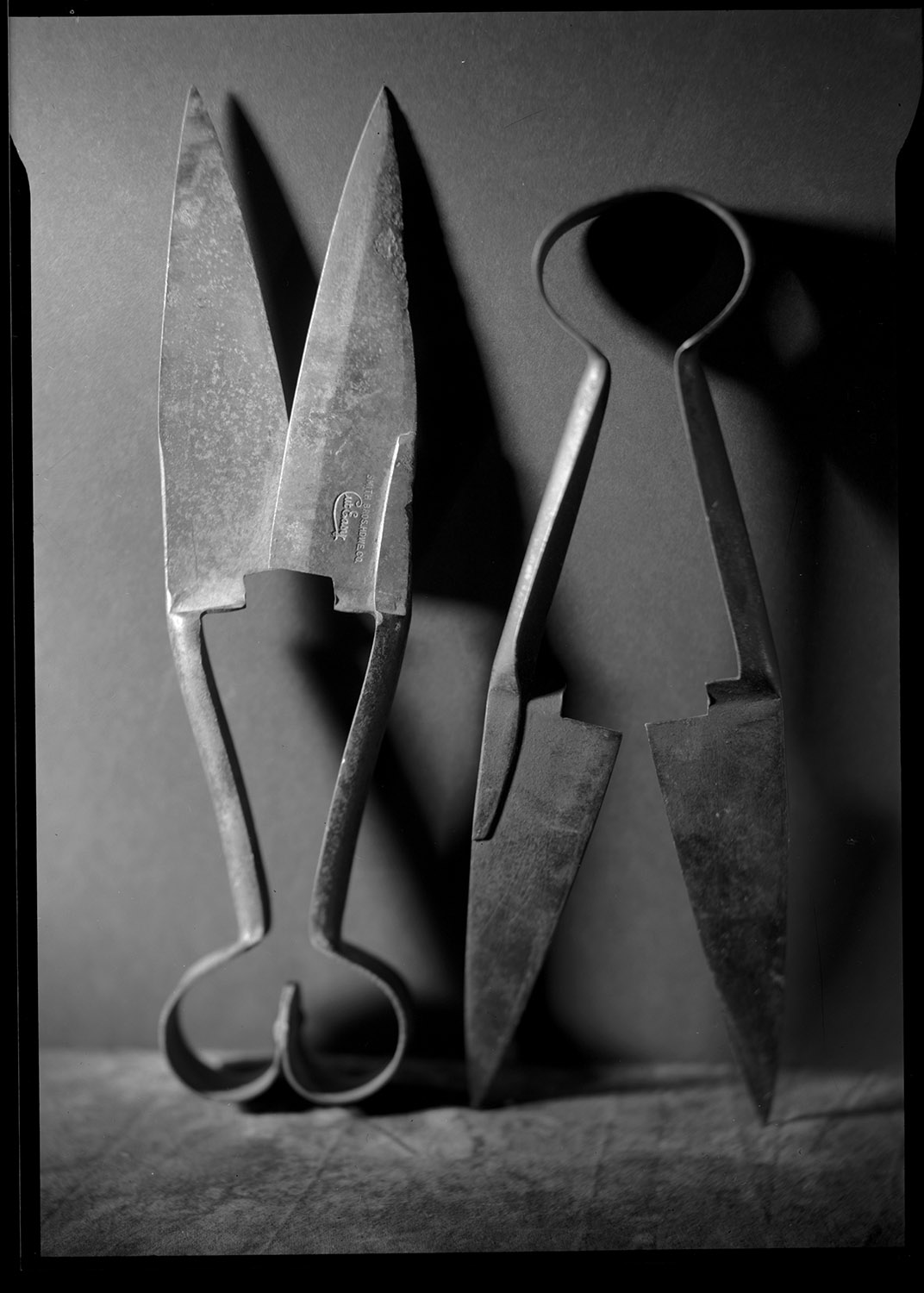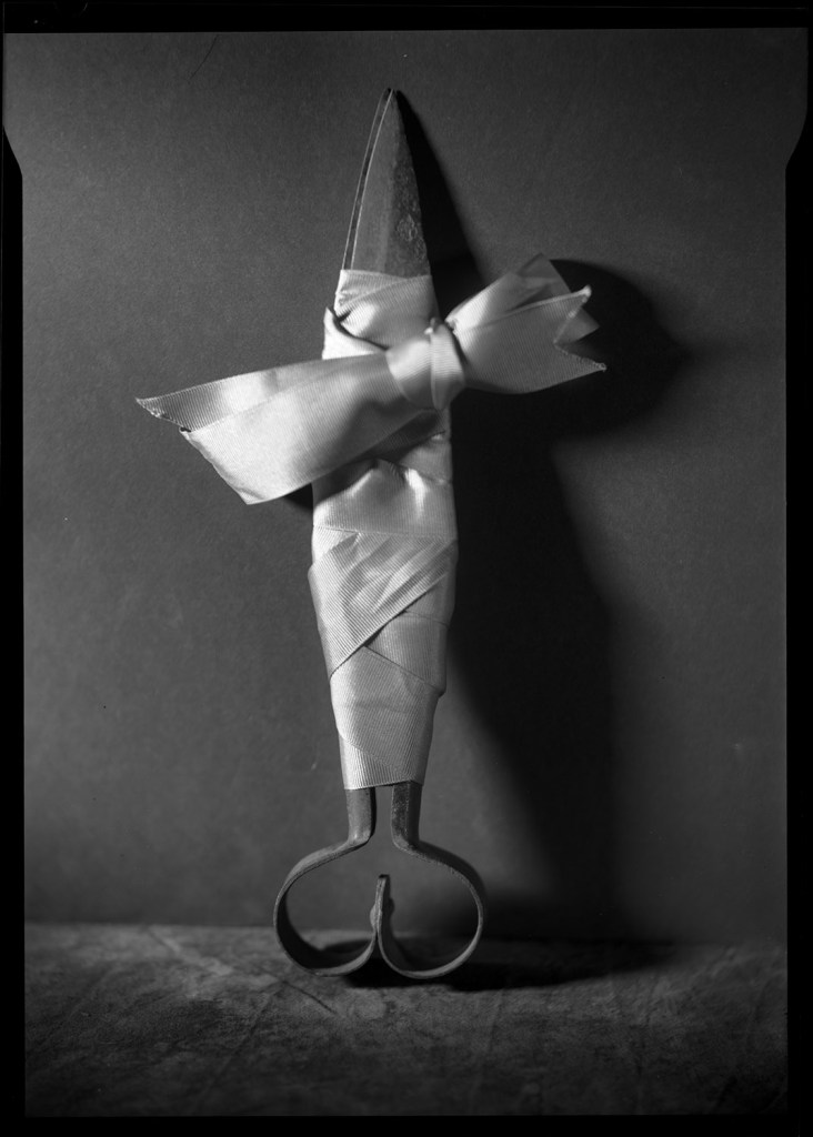 Broken Ostrich EggBinding What Cuts – Antique Garden Shears Bound With Purple RibbonBroken Whisky BottleTwo Pair of Garden Shears, unbound