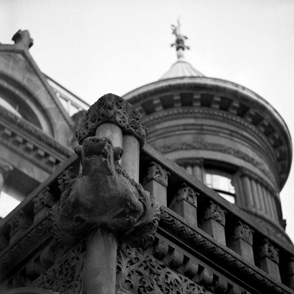 Looking up, this is one of the gargoyles on the outer edge of the porte cochere, and behind it the ornamental spire on the turret that inspired the house’s nickname, Brewmaster’s Castle.