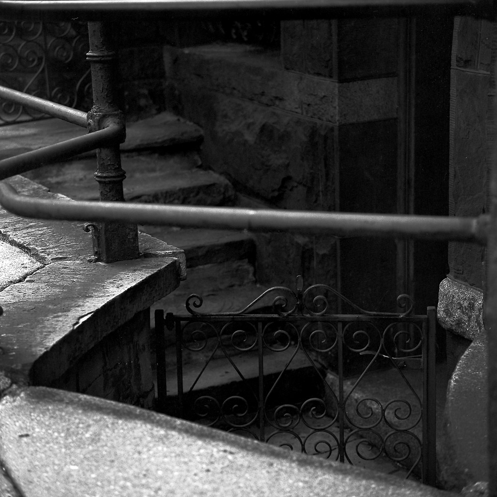 The trade entrance has TWO wrought-iron gates, one at the top and another at the bottom of the stairs.