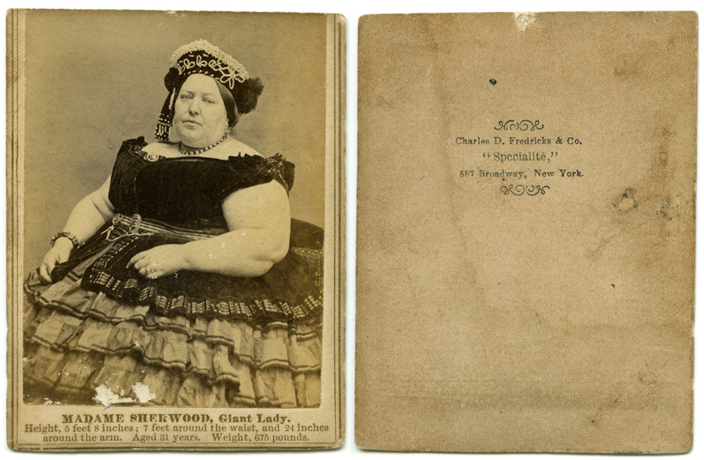Here is a cdv of a sideshow family. Father has an extraordinarily long beard, mother is a dwarf, and daughter seems relatively normal except her hands look HUGE in comparison to the rest of her (and even compared to dad’s hands).