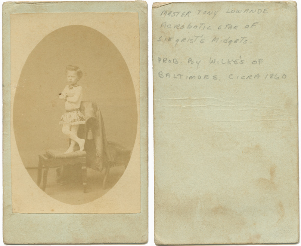 Mr. Lowande doesn’t look particularly happy to be having his picture taken. But that combination of tights and skirt not only look uncomfortable, I suspect wearing them outside the carnival tent would tend to challenge the masculinity of all but the most self-confident of men. This CDV is probably by D.J. Wilkes of Baltimore – although there is no identification on this card, the image is identical in all but pose (same outfit, same props) to another one I found online with the photographer’s imprint. I’m having a devil of a time finding more specific information about Mr. Lowande – most of the references I find for that name refer to an equestrian performer (that may be the same Tony Lowande, but I’m not sure), and the dates would seem to be later (that Tony Lowande was born in 1869 according to Olympians of the Sawdust Circle) and part of a famous family of Brazilian-American circus performers. Or it could be just that everything else about the photo aside from the name and photographer’s ID is wrong – Tony Lowande might just have been a five year old boy in this photo, and not a midget. I could also not find any reference to Siegrist’s Midgets, but that doesn’t mean anything per se.