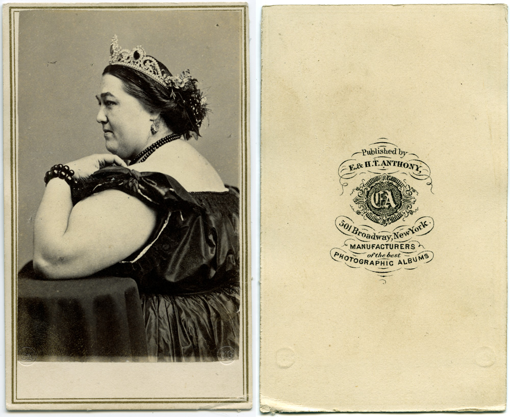 This image is an E&H.T. Anthony publication, with no credit given as to the photographer. The image has the Anthony blind stamps in the corners, and what appears in the scan to even be a fingerprint, possibly of the person who printed and mounted it. It is a breathtakingly beautiful carte in person, and I would suspect that it is probably a Brady carte, given that Anthony owned the Brady negatives for many years, and served as Brady’s publisher/distributor. The lady appears to be Madame Sherwood, a famous fat lady in Barnum’s circus. She also bears a vague resemblance to another fat lady I have, this one from the Brady studio in Washington DC. I don’t think the Brady image is the same woman, but it’s possible.