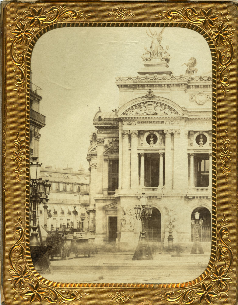 Here is an oddity – a cased albumen print of the Paris Opera house, taken shortly after it opened. The Opera was commissioned in 1861, and completed in 1875. The image could be as early as 1867, when the facade of the not-yet-completed opera house was bared of its scaffolding for the first time. This was taken with a wet-plate camera – notice the foggy foreground? That was pedestrian traffic blurring in the long exposure required by the collodion emulsion.