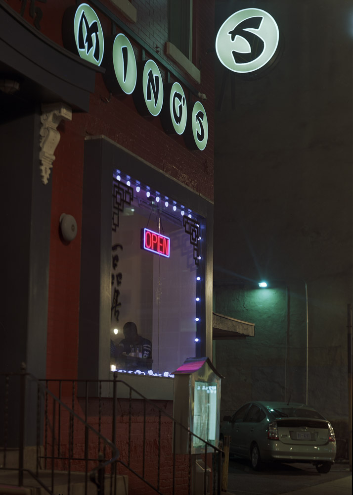 I liked the juxtaposition of the empty sidewalk out front, the lone Prius in the parking lot next door, and the intimate diners in the window.