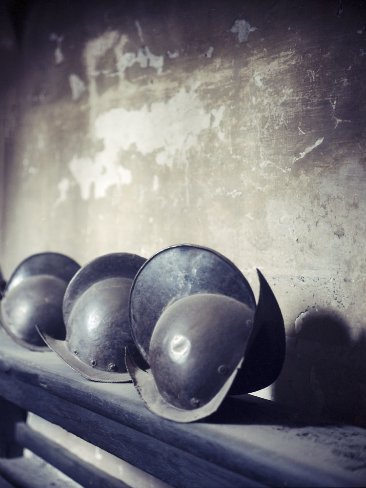 In a guardroom in the Castel Sant’Angelo preserved as an example of what such a space would have looked like in the 17th or 18th century, a row of steel helmets have been laid out:
