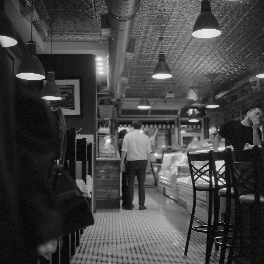 One of the things that happens when you test out a new film is that you discover character quirks that help you decide how and when to include it in your palette of options. Delta 3200 is a high-speed yet (at least in 120) relatively fine-grained film. Since my Rollei has a top shutter speed of 1/500th of a second, the film’s speed severely curtails my ability to use it in daylight situations. In low light, though, that vice becomes a virtue and I can hand-hold photos that I would ordinarily need a tripod for. That was, as Donald Rumsfeld would have put it, a “known known”. A characteristic I did not know until I actually developed the film was that apparently Delta 3200 does not have an anti-halation coating. Anti-halation coatings prevent ‘blooming’ in highlights that give a “glow” to light sources within a scene. When you don’t want that, having it can be bad. However, in a scene like this, it really works and gives a warm atmosphere to the scene. This is a shot that I think when I make a silver-gelatin enlargement of it, I’ll sepia-tone the print to give it that extra warmth, and give it a real ‘coffee’ atmosphere.