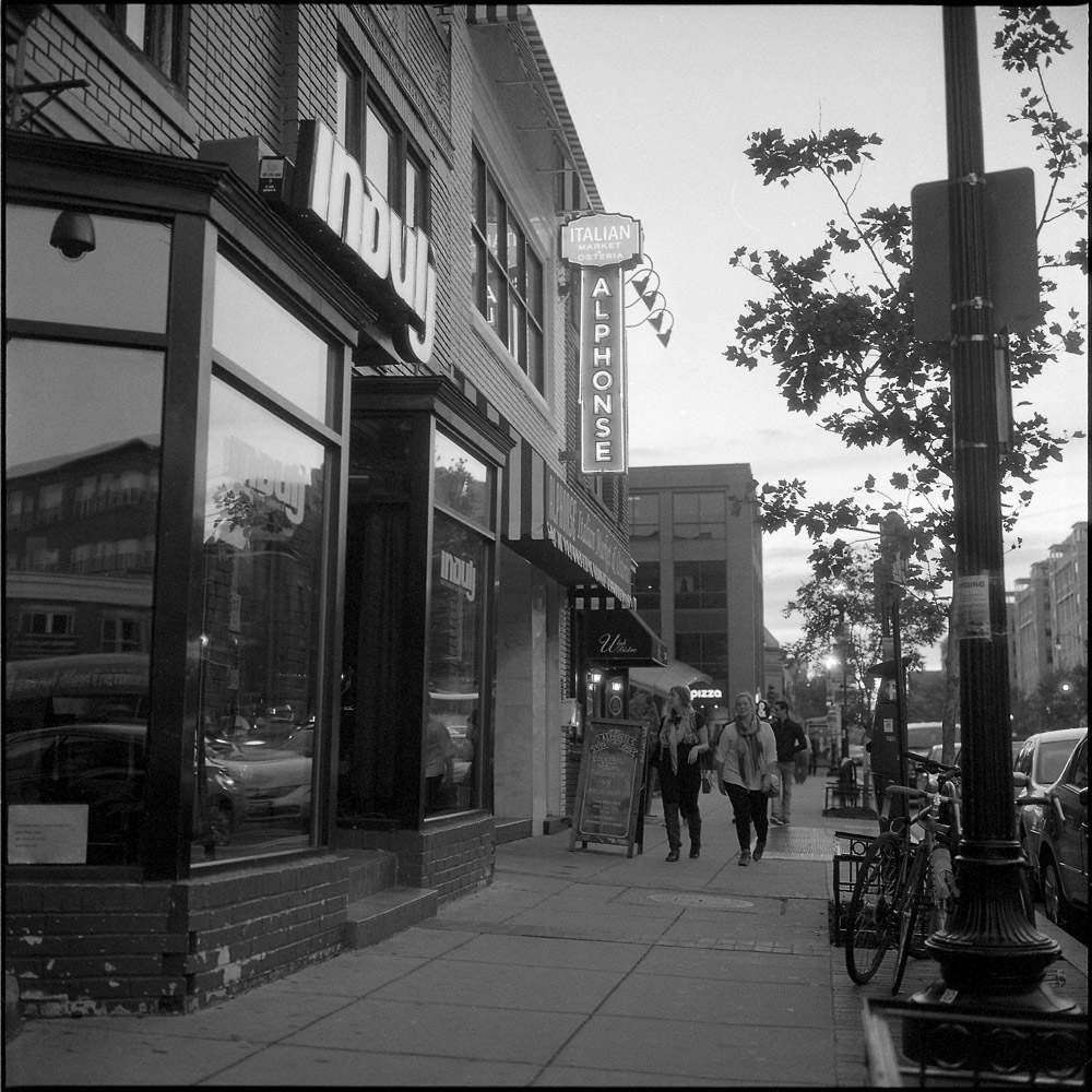 The doors to The Coffee Bar were catching the last blush of sunset in the sky, and the reflection of the street lamp just starting to glow in the twilight. I love this kind of light at this time of day, where the sky is dimming to be just as bright as the landscape below. This is one shot where I wish I had the second Rollei with me and some color film loaded, as I would have liked to capture the deep blue sky, the patina’d green lamppost, and the orange glow of the street lamp globe reflected in the window, the gold leaf of the street number and ‘The Coffee Bar’ on the glass twinkling in the sun’s last rays. Another time – I know where it is, and I can always go back in for a good chai to warm me up on a chilly fall evening.