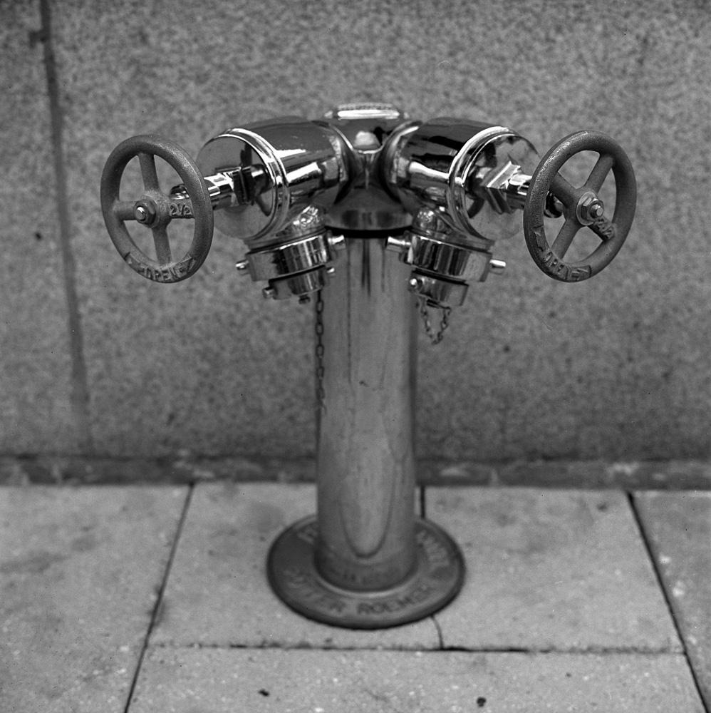 For wont of anything better to do on Sunday afternoon, I went out for a stroll in the 90+ degree heat (what was I thinking!!!) with the Rolleis for company. I wanted to do a little film and development test to see how well my results would come out. I’d say I nailed it based on these shots. The film I was testing is Ilford PanF, a very slow, fine-grained emulsion. The film speed Ilford recommends for this film is ISO 50. Quite a few folks I know recommend giving it a more generous exposure and rating it at EI 12. I shot some before at EI 25 and got good but not knock-your-socks-off results, so I thought I’d try the 12 and see what difference it makes. I took a risk and changed two variables at once – film speed and development technique. Normally I use Rodinal at a 1:50 dilution and develop for 14 minutes, agitating the chemistry for five seconds out of every 30 seconds. This time, I used Pyrocat HD for my developer, gave it twice the normal dilution (I usually use it diluted 1:1:100, but this time I used 1:1:200) for 45 minutes, with 5 seconds of agitation every 15 minutes.