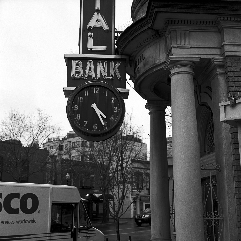 These two photos are of neighborhood icons – you’ve seen my color photo of Cavalier Liquor at night before. It has been the subject of many a photograph by fans of urban texture, neon, and Deco architecture. Hellers Bakery has been in their current location for many many years, and if you saw the movie “State of Play” starring Russell Crowe as Cal McAffery, a hard-luck, hard-boiled reporter who uncovers a Washington conspiracy, you’ll recognize their neon sign from below his apartment window. I’m very annoyed with Hellers that they don’t illuminate their sign very often, so it makes it very hard to get a good photo of it after dark!