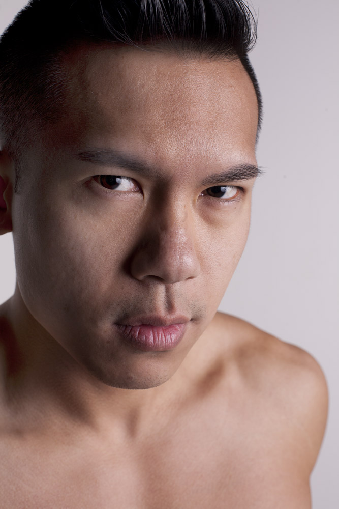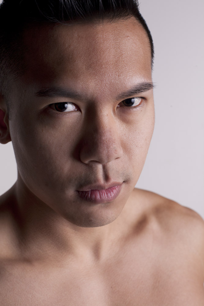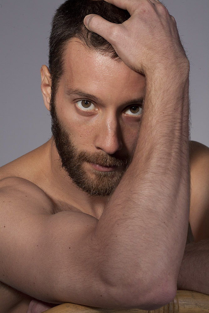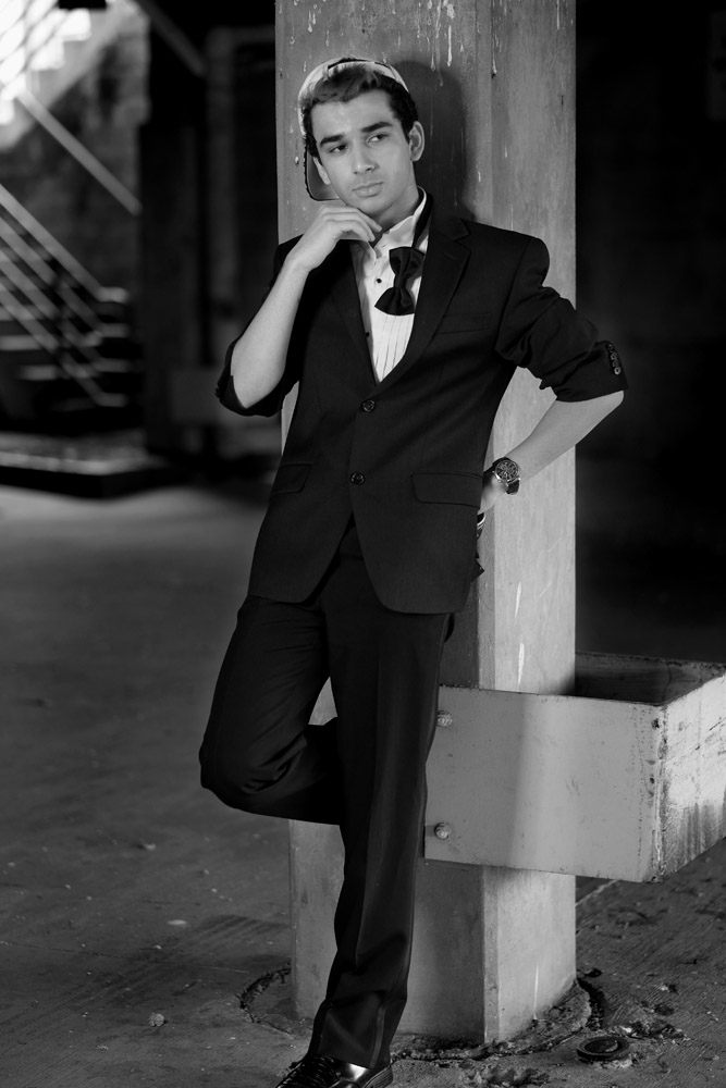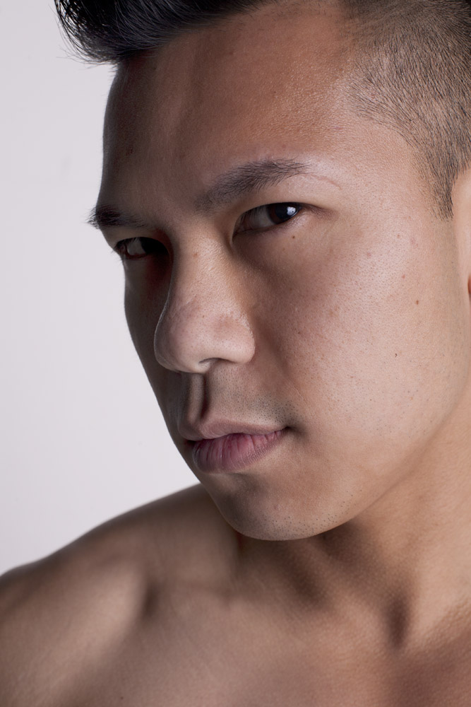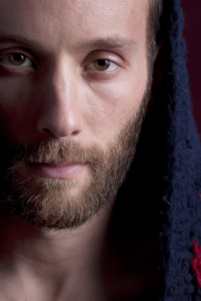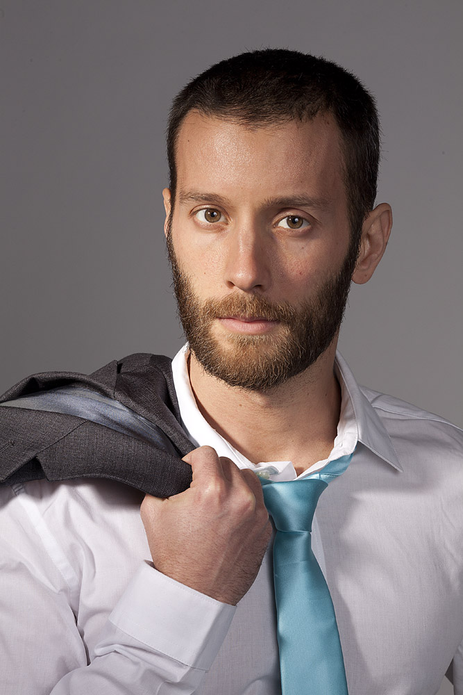 Mustafa has a great face – he looks good from lots of angles. When posing a model or a portrait subject, you want to make sure that you’re not doing anything un-flattering. If you’re turning the head away from front-on, you want the nose to either obviously stand back from or break the contour of the cheek so you don’t inadvertently flatten it by having it by having the tip of the nose meet the outline of the cheek. At the same time, pay attention to the eyes – you want to see whites on both sides of the iris. If you turn someone’s head in part profile and then have them look back at the camera with their eyes, the irises in the corner of the eye make them look like a psycho-killer. In these shots it works because he’s looking the same direction with his eyes as his face is pointing.