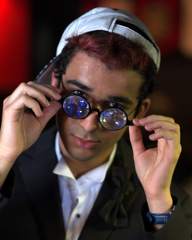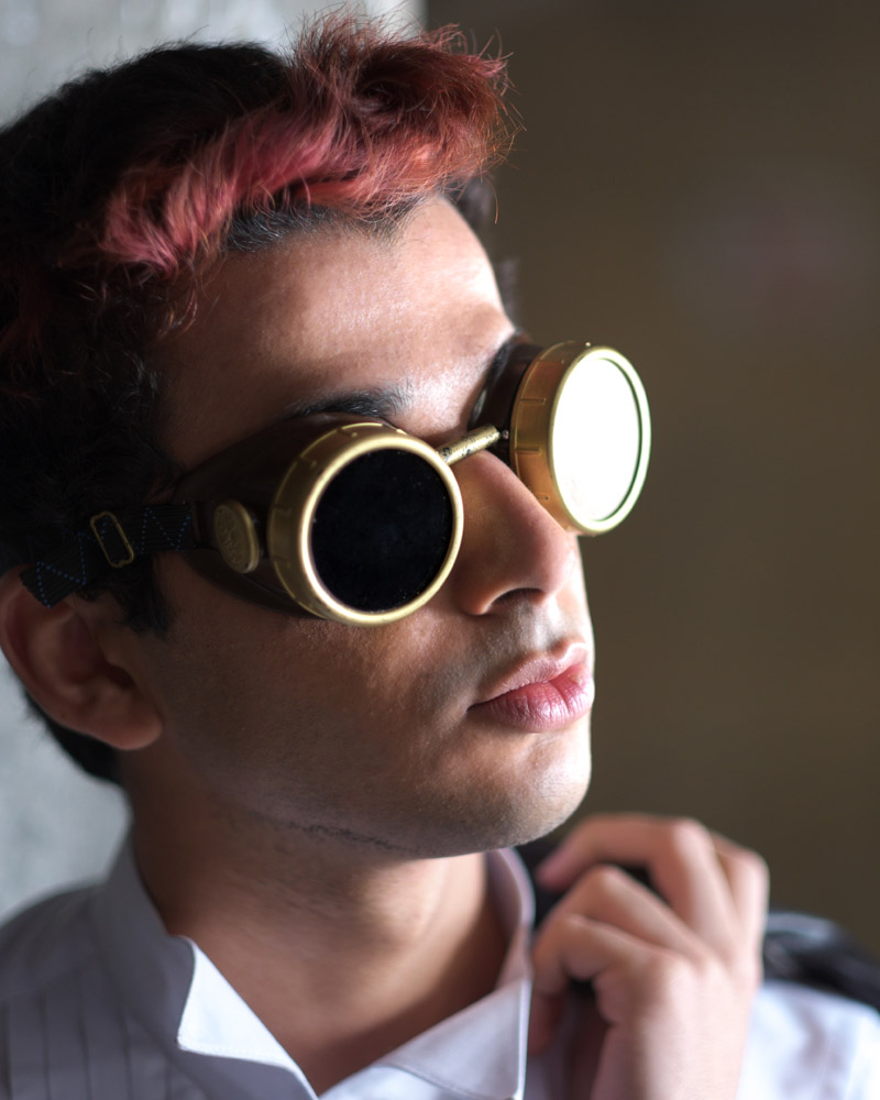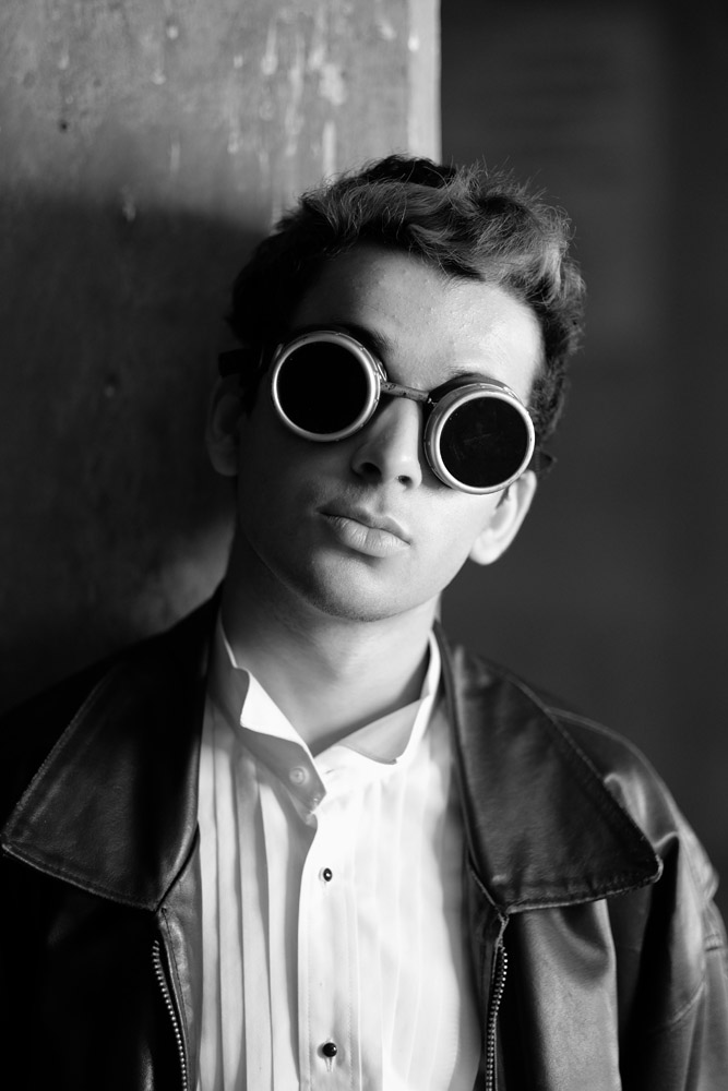 Mustafa showed up to the shoot in a tux, which is hard to work around if that’s not what you’re aiming for. It’s a good look, and a very elegant one, but not necessarily fitting a pool hall. I tried to shake things up a bit with the kaleidoscope glasses, the steampunk welder’s goggles and my own vintage leather jacket. Tip to models – unless you are told wardrobe will be provided, always bring at least two different looks to a test shoot with you so you don’t get stuck looking out-of-place on the shoot.