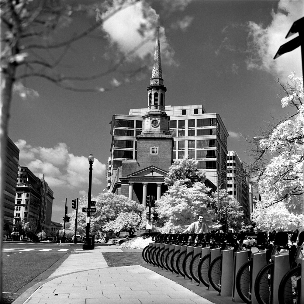 The infrared effect is somewhat subtle in these first two – the foliage is white, but the sky is not particularly black or contrasty. The red bikeshare bikes though are much lighter than they appear on regular b/w or color film. Also the wheel guards on the back wheels are completely translucent, but in real life they are dark smoked and/or black plastic.