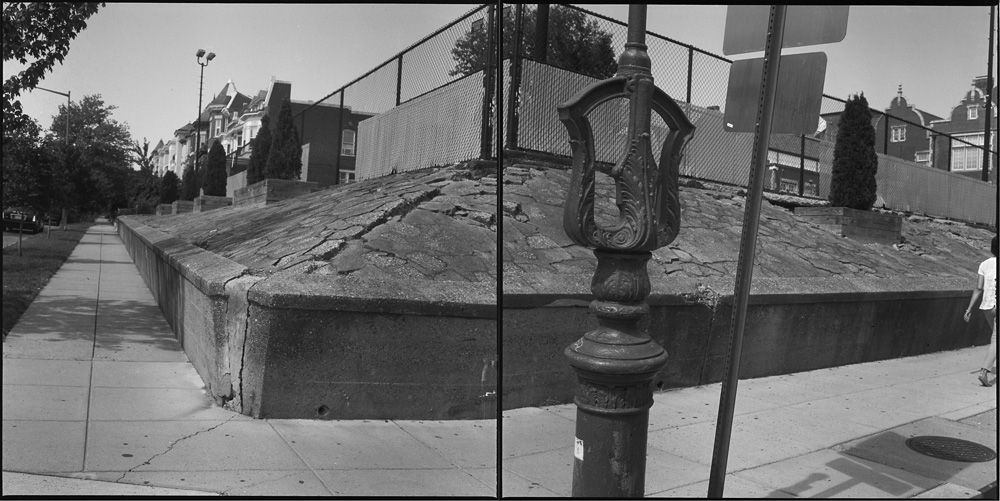 The first one is a shot of a street corner with the skeletal remains of a police call box from the first decade or so of the 20th century. The building behind it is now a charter school. I’ve often thought of how to photograph the wall around the playground fence behind the school. This is the first shot I’ve done that really does it justice.