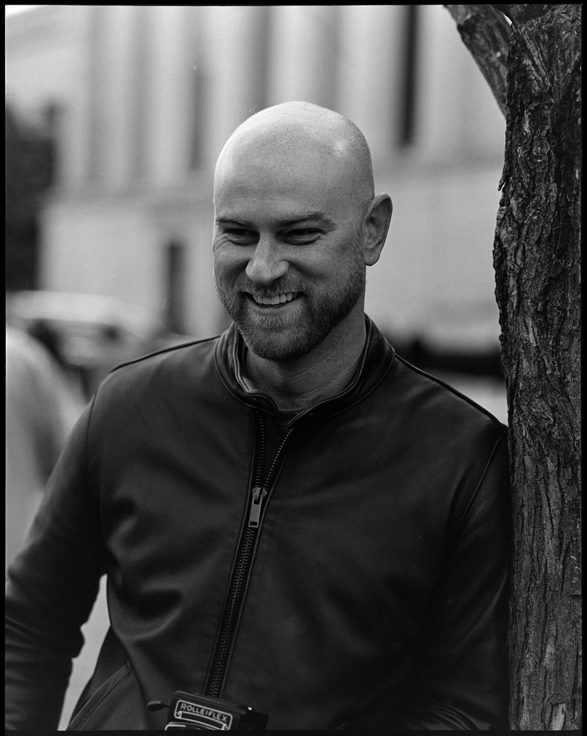 Chris Gumm, who coincidentally practices gum bichromate printing, posing with his Rolleiflex.