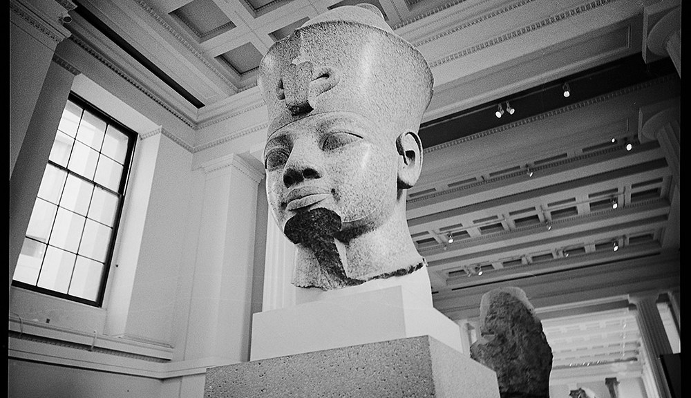 A moment of serendipity as I was photographing the red granite pharaoh’s head in the British Museum caught the face of a passer-by in the lower right corner breaking through a beam of light, an equally enigmatic expression on their face as on the Pharaoh’s. In the far background, a second Pharaoh looks on.