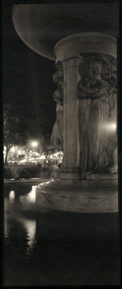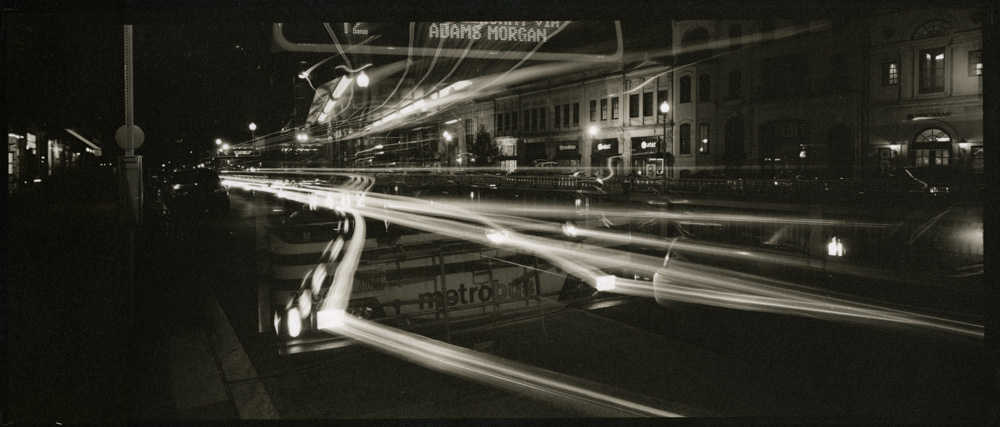 Well, I finally got off my keyster and went out shooting tonight. I loaded up ten sheets of 5×12 in the Canham and went over to Dupont Circle to burn some long exposures onto film. This process always takes a lot longer than you think it should because inevitably setting up with a 5×12 (or any view camera for that matter) invites dozens of total strangers to approach you and ask questions. I always view it as an opportunity to educate people about the ongoing viability of film photography, and so I’m always happy to chat, even if the light is changing (fortunately after dark there’s no worry about the light changing – you only need to take one meter reading and stick with it for the rest of the shoot).