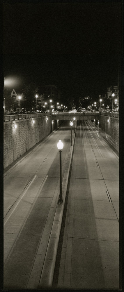Some of my prints from the shoot on Saturday night. These are all palladium prints. The images were shot with my Canham 5×12. All images were taken around Dupont Circle. You can see from the bus photo that these were obviously long time exposures (the bus was somewhere north of 2 minutes, in multiple snaps of 30+ seconds each). The bus was an experiment that didn’t produce the expected result, but in a bout of serendipity turned out something just as cool as my original concept. I was hoping the bus sitting still as passengers boarded would record as a solid object. Instead, it became something far more abstract in the final image – you can recognize the bus, in pieces. It became an essay on motion, transportation and “transit/ion” by virtue of its self-deconstruction.