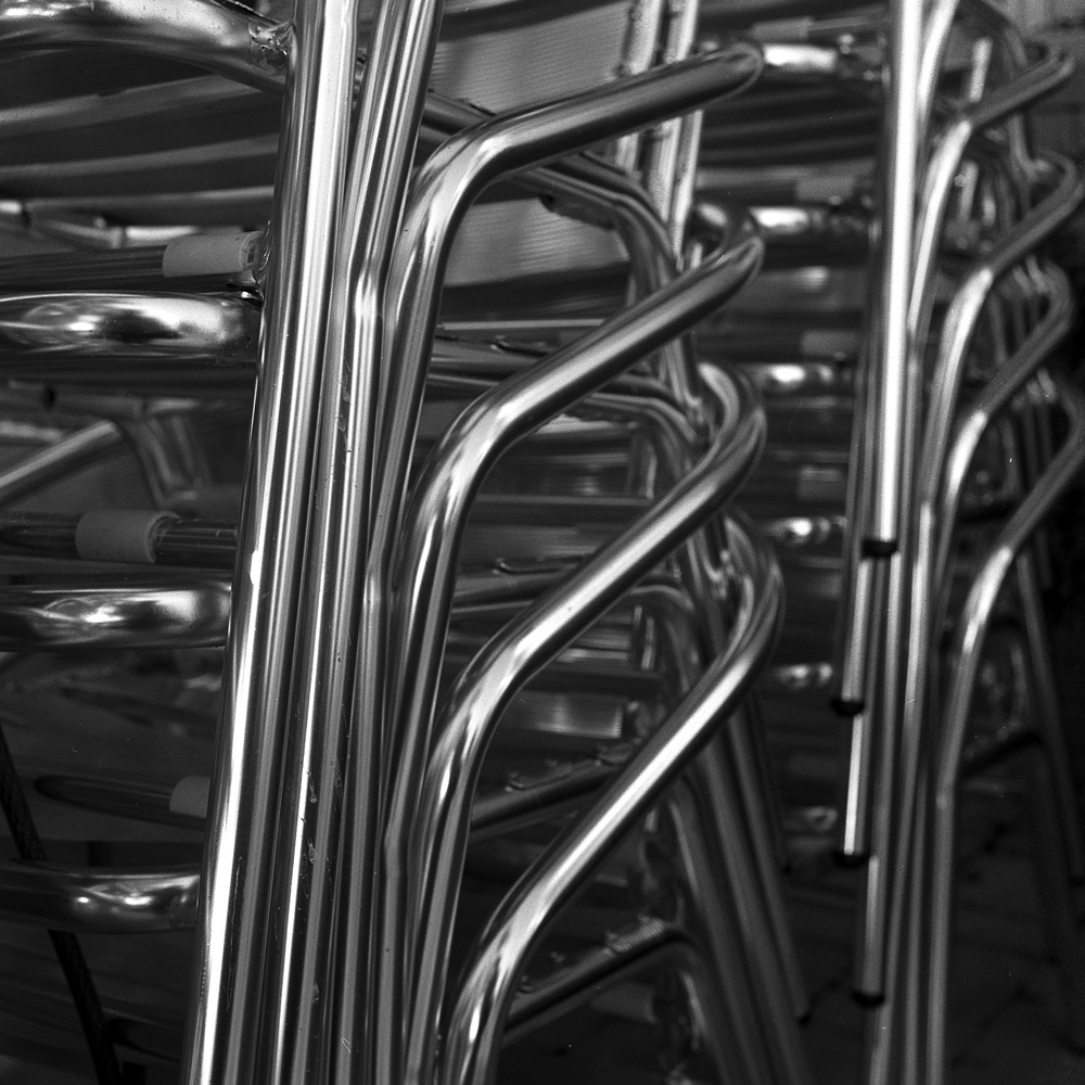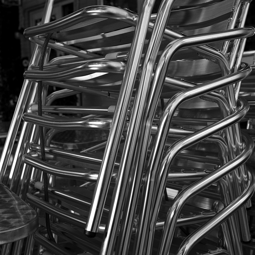 The chairs were still stacked from having been stored the night before. I loved the repetition of the shapes of the chairs.